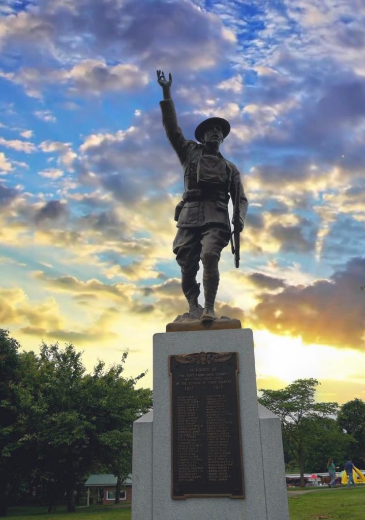 The Monument depicts a World War 1 veteran striding forward holding a rifle at waist height in his left hand, holding his right hand high above his head. A plaque on the base is inscribed, “In honor of the boys from Ross County who gave their lives in the service of their country 1917 – 1919.”