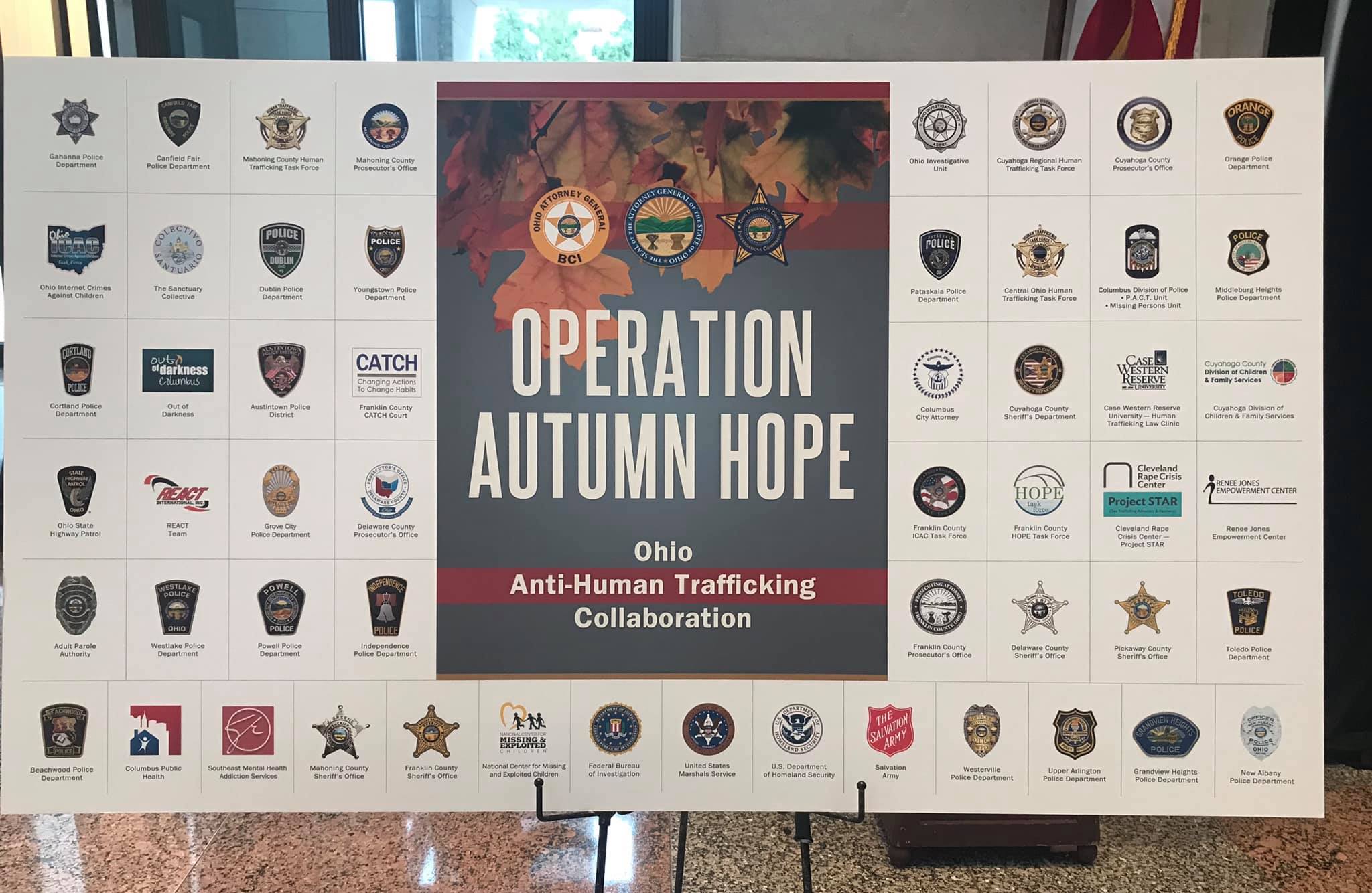 The agencies and entities that participated in Operation Autumn Hope were the Ohio Bureau of Criminal Investigations, National Center for Missing and Exploited Children, U.S. Marshal’s Service, FBI, Central Ohio Human Trafficking Task Force, Columbus Division of Police P.A.C.T. Unit, Columbus Division of Police Missing Persons Unit, Franklin County Sheriff’s Office HOPE Task Force and ICAC Task Force, Columbus City Attorney’s Office, Franklin County Prosecutor’s Office, Dublin Police Department, Powell Police Department, Grove City Police Department, Gahanna Police Department, Upper Arlington Police Department, Westerville Police Department, Grandview Heights Police Department, New Albany Police Department, Southeast Mental Health Addiction Services, Columbus Public Health, The Sanctuary Collective, CATCH Court, Out of Darkness, RREACT Team, Delaware County Sheriff’s Office, Delaware County Prosecutor’s Office, Mahoning Valley Human Trafficking Task Force, Mahoning County Sheriff’s Office, Mahoning Count Prosecutor’s Office, Canfield Fair Police Department, Youngstown Police Department, Ohio Internet Crimes Against Children, Austintown Police District, Cortland Police Department, Ohio State Highway Patrol, Ohio Department of Public Safety’s Ohio Investigative Unit, Adult Parole Authority, the Cuyahoga County Regional Human Trafficking Task Force, Cuyahoga County Sheriff’s Department, Cuyahoga County Prosecutor’s Office, Independence Police Department, Westlake Police Department, Beachwood Police Department, Orange Police Department, Middleburg Heights Police Department, Cuyahoga Department of Children and Family Services, Case Western Reserve University, Cleveland Rape Crisis Center, and the Renee Jones Empowerment Center.