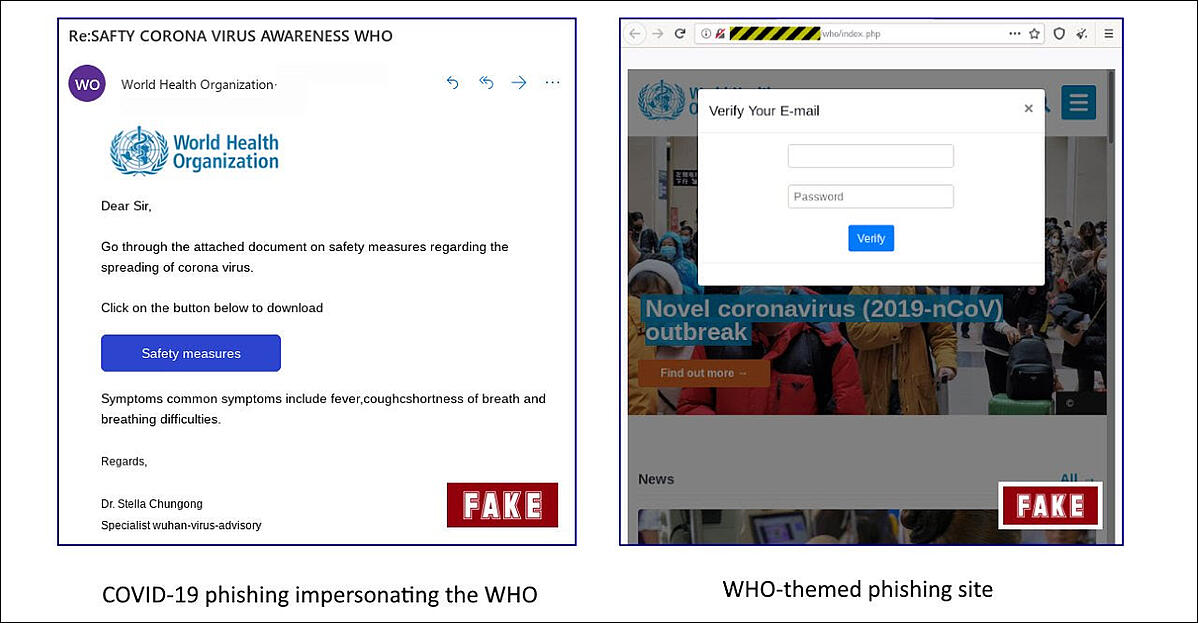 Ongoing Coronavirus-themed phishing attacks that impersonate the WHO and try to steal confidential information and deliver malware.