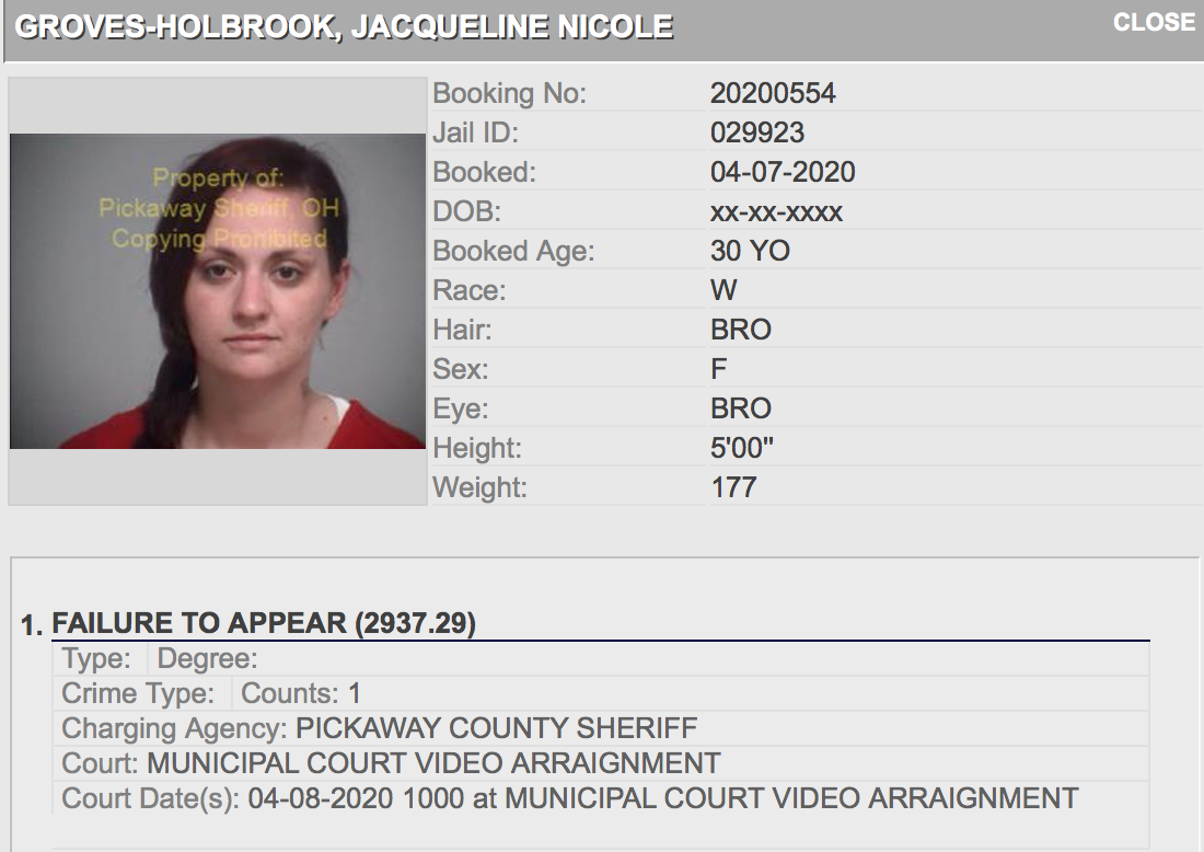 • Jacqueline Groves-Holbrook, 30 of Circleville, arrested for Failure to Appear warrant.