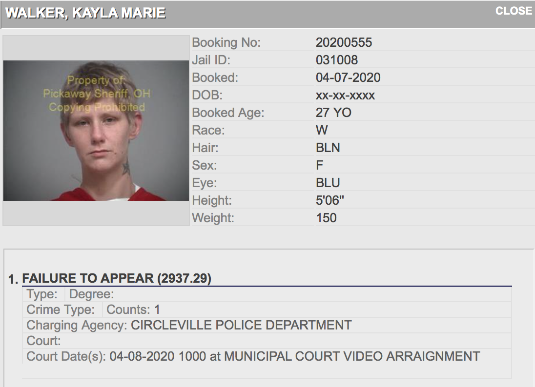 • Kayla Walker, 27 of Circleville, arrested for Failure to Appear warrant and a warrant from another jurisdiction.