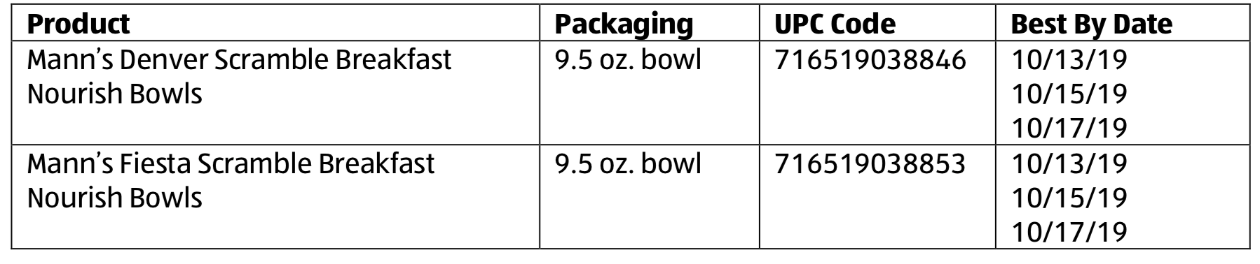 Batavia, Ill. – In cooperation with Mann Packing Company, Inc., and out of an abundance of caution, ALDI is voluntarily recalling Mann’s Denver Scramble and Fiesta Scramble Breakfast Nourish Bowls due to possible Listeria monocytogenes contamination.