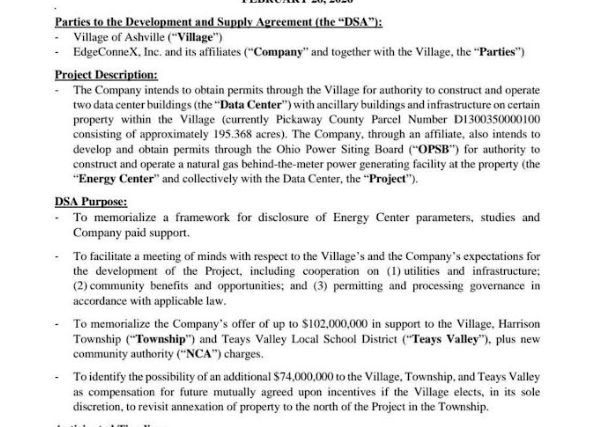 At the center of negotiations is EdgeConneX’s offer of up to $102 million in financial support to the Village of Ashville, Harrison Township, and the Teays Valley Local School District.
