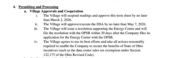 As part of the agreement, council would acknowledge that the village’s existing data center moratorium — enacted in December 2025 — does not apply to this project and would suspend it specifically for EdgeConneX’s development.