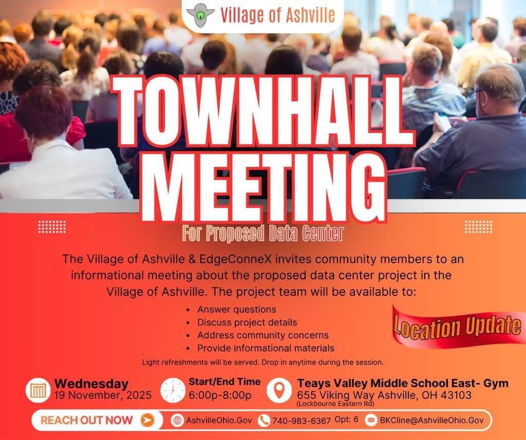 ASHVILLE, Ohio – The Village of Ashville has relocated Wednesday’s informational meeting on the proposed EdgeConneX data center to a larger space, citing anticipated high turnout