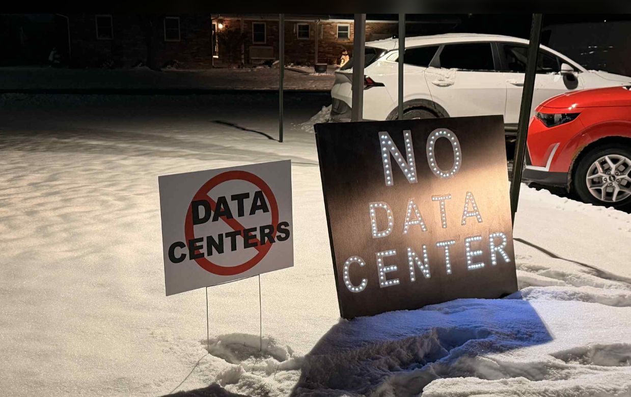 Members of the public made their stance visible by wearing “No Data Center” buttons and red clothing along with a lighted No Data Center sign in the snow outside, signaling strong opposition to the facility at its proposed location.