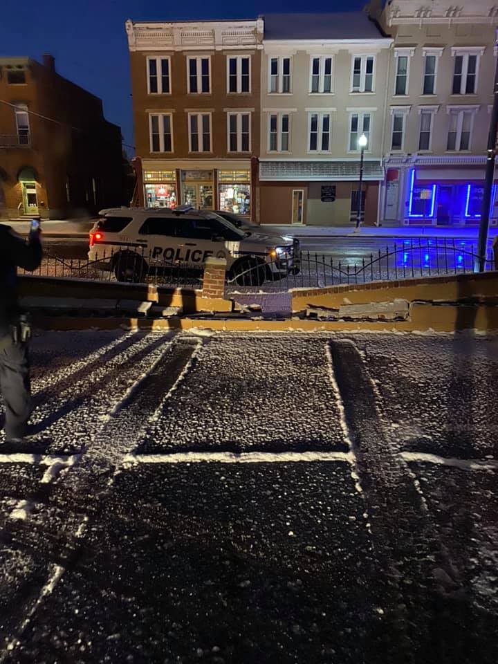 According to BialyCorp the tracks in the snow indicate that the vehicle after crashing left the scene and headed down the alley towards pumpkin show park. The company is requesting and video footage anyone has of the incident in the area, and are asked to call 740-497-4425