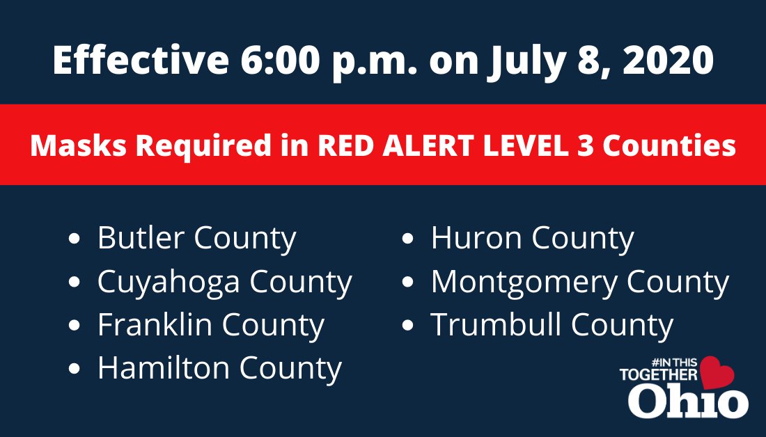 Dewine said, “This order will stay in effect as long as these counties are in a red level or if they increase to the Purple Alert Level 4. If the counties drop to a Level 2, the requirement will drop off.”