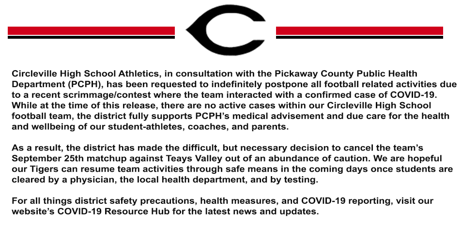 Circleville High School athletics says that they will postpone any football related activities due to a recent scrimmage/contest where the team interacted with a positive case of COVID-19.
