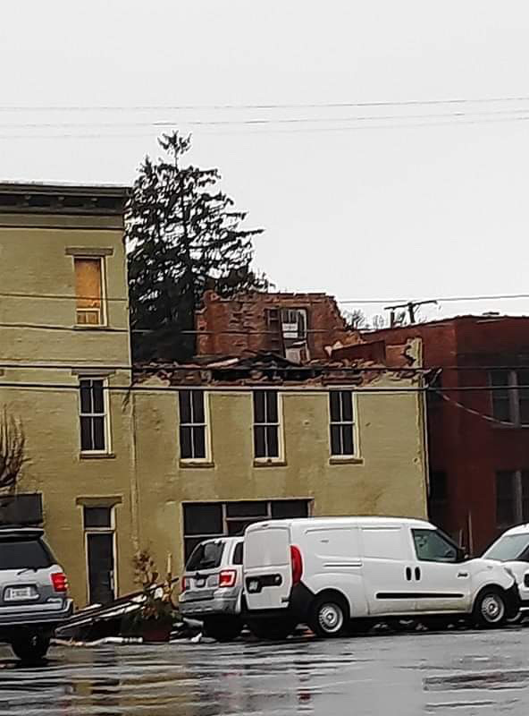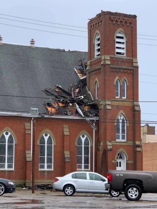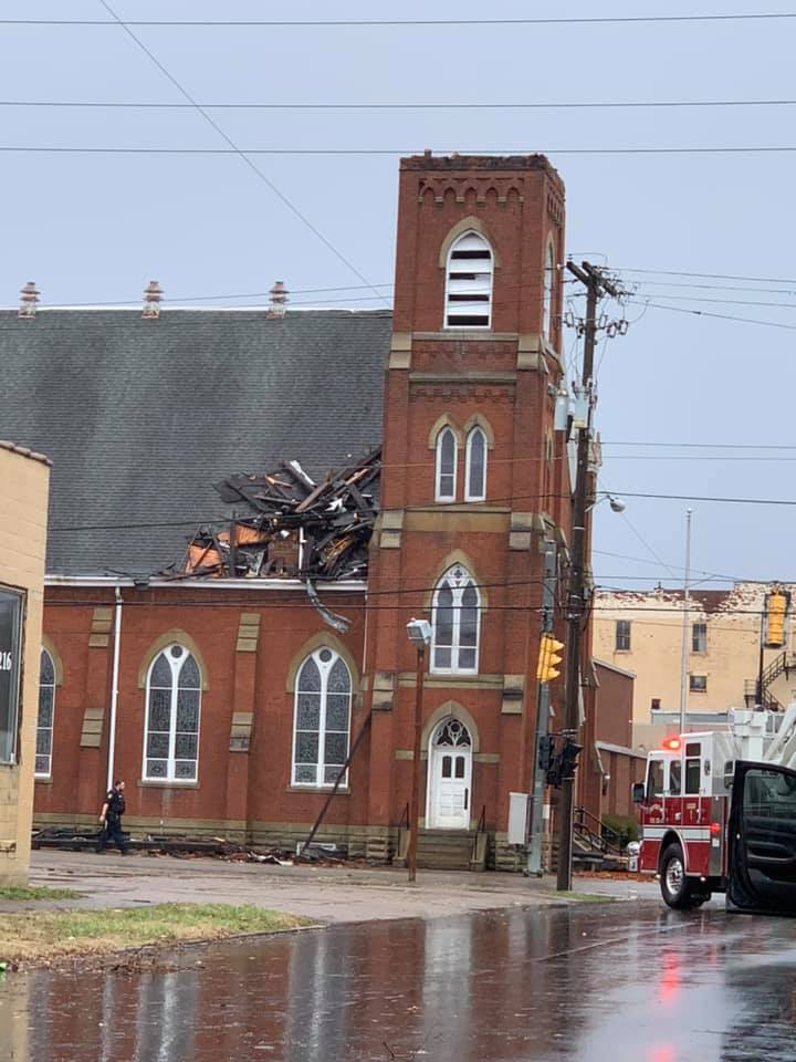 In downtown Portsmouth a local church roof has blown off, and the top of a building across from Community Action.