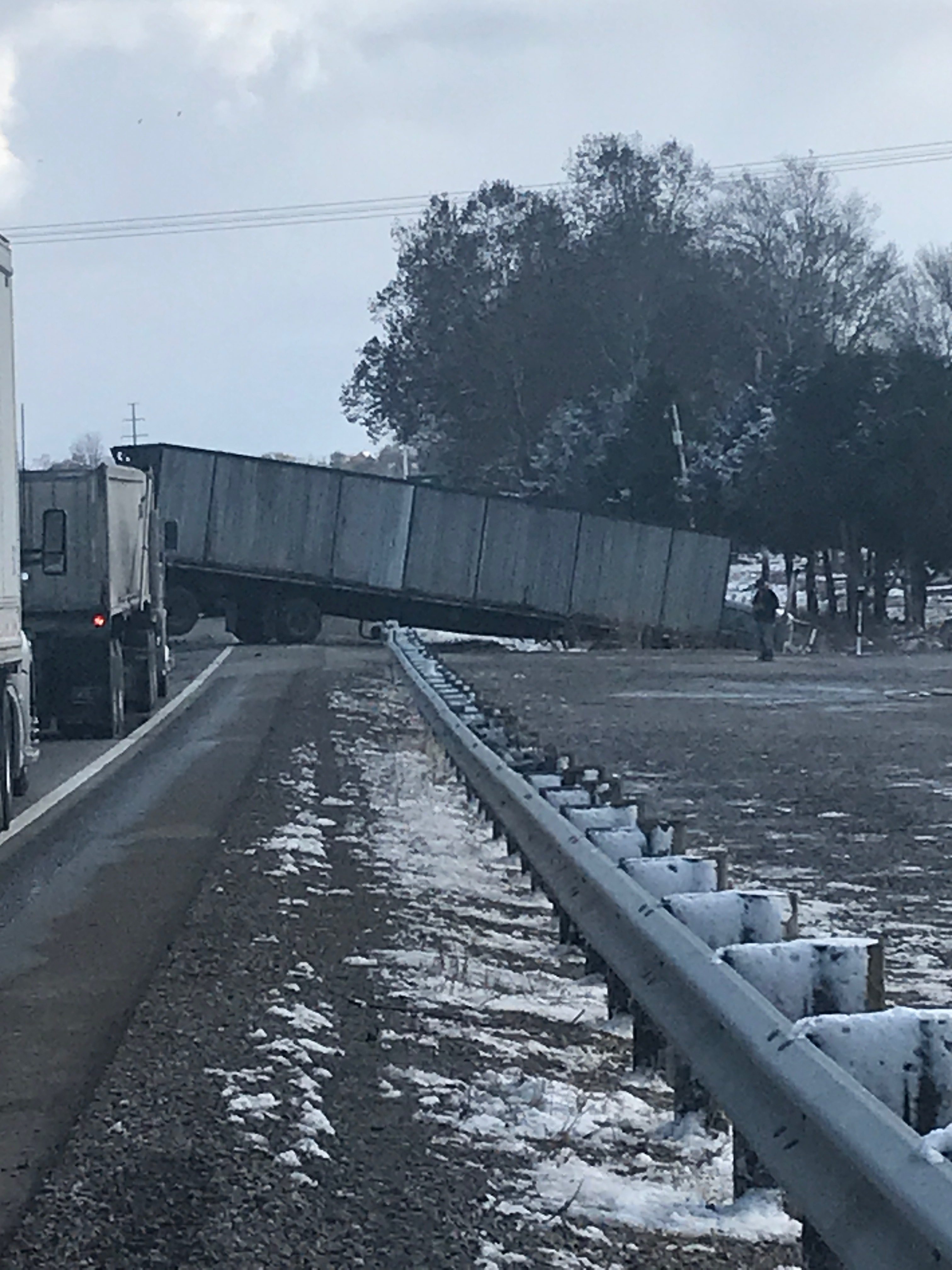 According to the scanner a long semi lost control and went off the road into the ditch. Half of the semi is still in the roadway and blocking both lanes of traffic at this time.