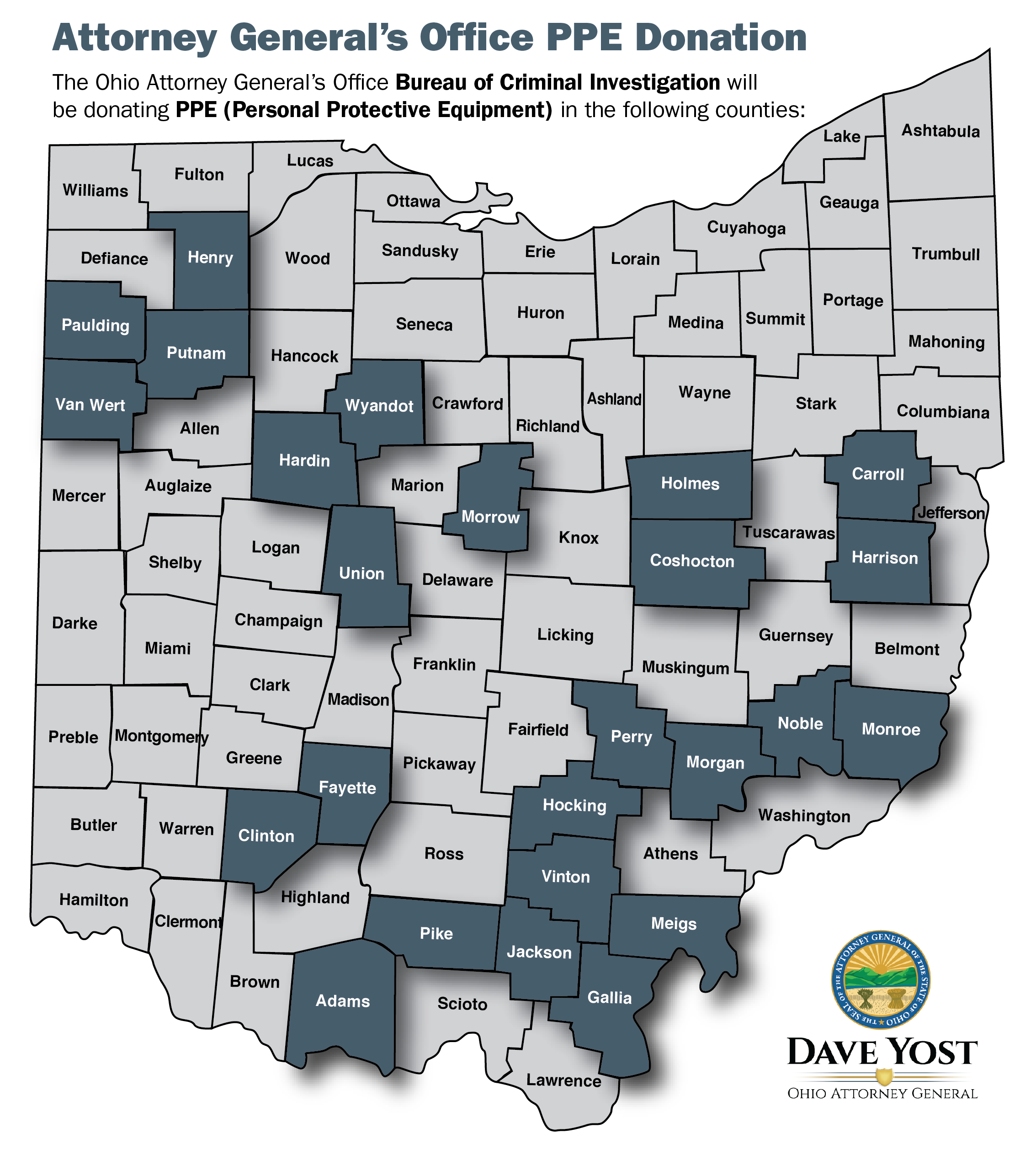 The PPE donations are being directed to some of the smallest sheriff’s offices across the state, which often have stretched budgets and may have the greatest need for supplies. Sheriff’s offices receiving PPE include: Adams, Carroll, Clinton, Coshocton, Fayette, Gallia, Hardin, Harrison, Henry, Hocking, Holmes, Jackson, Meigs, Monroe, Morgan, Morrow, Noble, Paulding, Perry, Pike, Putnam, Union, Van Wert, Vinton and Wyandot counties.