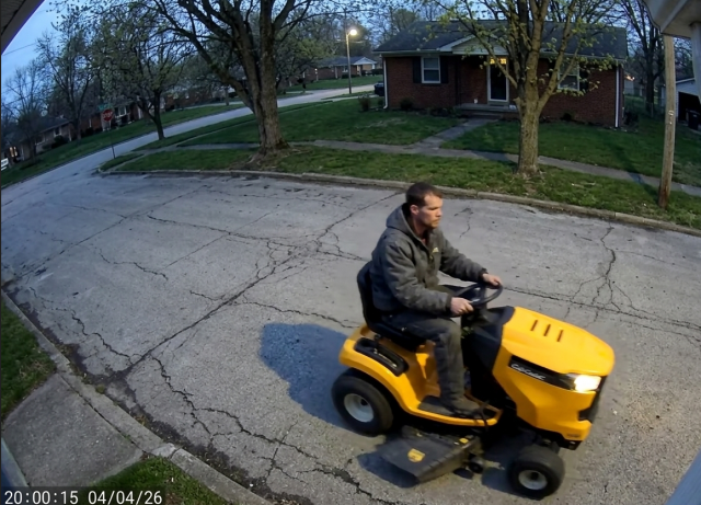 The break in the case came several days later, on April 6, when a resident provided police with Blink camera footage from a home on Sumpter Avenue. The video showed Bickers riding a yellow mower through the neighborhood around 8:00 PM on April 4.