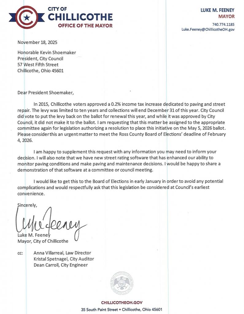 Chillicothe Mayor Luke Feeney’s November 18th request for legislation on the street levy renewal: