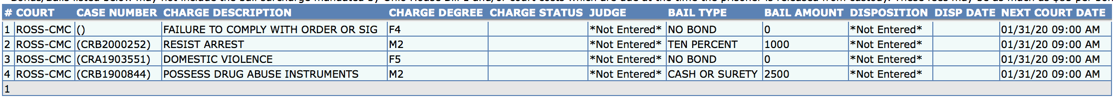 Frasure was transported to the RCJ for Failure to Comply, Resisting Arrest as well as two outstanding warrants for his arrest after being treated at local hospital for minor injuries. Frasure also had two warrants one from Chillicothe Municipal FTA warrant  on an charge of Drug Paraphernalia and Chillicothe Municipal IBA warrant for Domestic Violence through the RCSO.