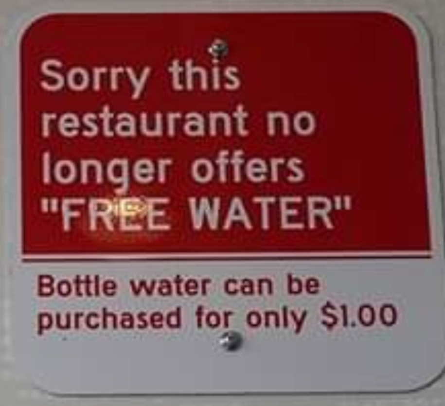 The sign hung in the restaurant clearly states they will no longer provide free water, instead customers will need to pay $1.00 per bottle.