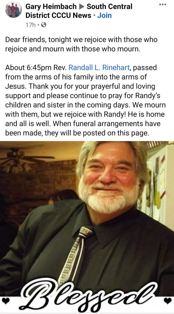 Home Passings Chillicothe OH- Rev. Randall L. Rinehart (August 4th, 1953 – June 23rd,... Passings Chillicothe OH- Rev. Randall L. Rinehart (August 4th, 1953 – June 23rd, 2021) By SPGuestAuthor - 06/24/2021 0 SHARE Facebook Twitter tweet Chillicothe OH- Rev. Randall L. Rinehart, 67, of Chillicothe, died Wednesday evening at Riverside Methodist Hospital, following a brief illness. Arrangements are being completed at this time. Please check back to this article for a full obituary.