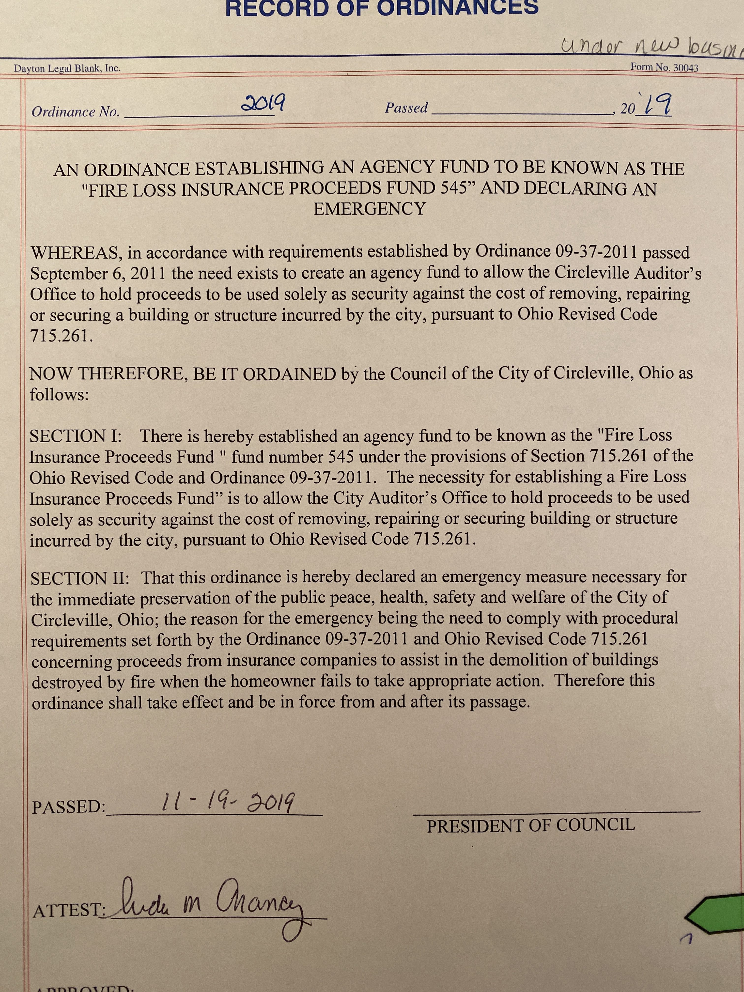 “Another tool in the toolbox,” said Tom Spring Circleville Council Member about this ordiance that would allow the city to hold proceeds solely as security against the cost of removing, repairing, or securing a building or structure incurred by the city. (Ohio Revised Code 715.261). “This ordinance is declared an emergency measure necessary for the immediate preservation of the public peace, health, safety and welfare of the city of Circleville.”