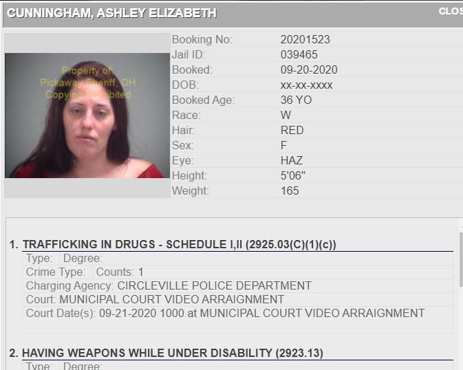 George Fisher III, Ashley Cunningham and Erica Anderson were criminally charged with two counts of trafficking in drugs (F2), two counts of Possession of Drugs (F2), and Improper handling of a Firearm Inside of a Motor Vehicle (F4). In addition, George and Ashley were criminally charged with Having Weapons While Under Disability (F3) and Ashley was also criminally charged with Receiving Stolen Property (F4). All three were transported to the Pickaway County Jail without incident.