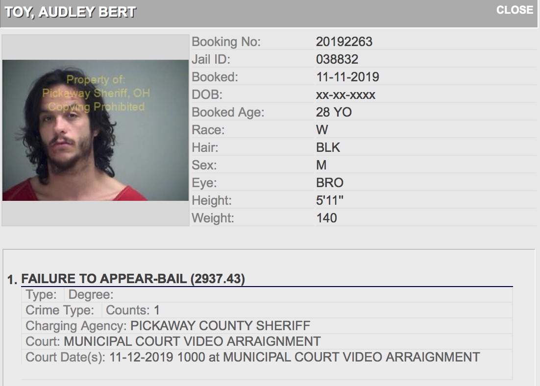 Disposition Comments: ARREST MADE ON AUDLEY B TOY FOR WARRANT OUT OF PICKAWAY COUNTY SHERIFF’S OFFICE. PRISONER TRANSPORTED TO PICKAWAY COUNTY JAIL. REPORT TAKEN.