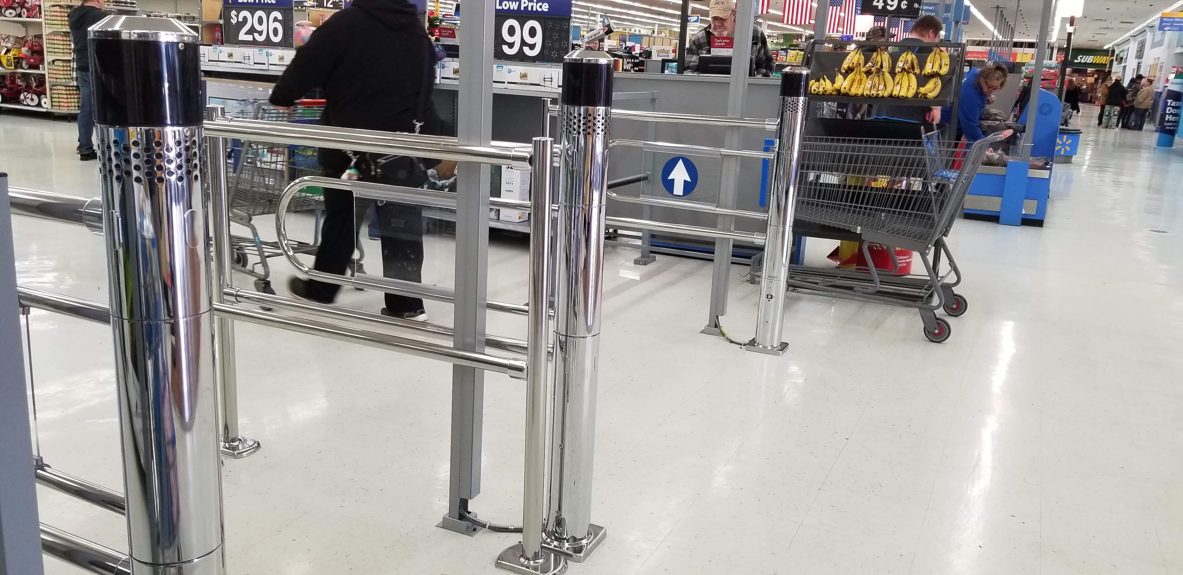 How do these gates work? They will be positioned at the front of the store where the Walmart greeter normally stands and they will allow people in but not people out though the same way. The gates will force customers and suspected thieves to go through check out counters to leave the store.