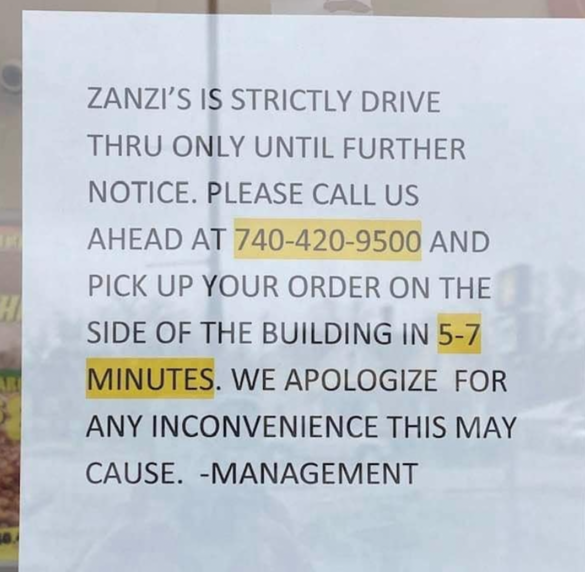 Circleville Zanzi’s has had a drive thru window since it opened, but wasn’t allowed to use it because of the alleyway that the window is on didn’t allow it according to code. Zanzi’s lobbied local help from citizens to get this to change over the years by posting a sign in their lobby, but when the opened up a sit in options that sign was removed.