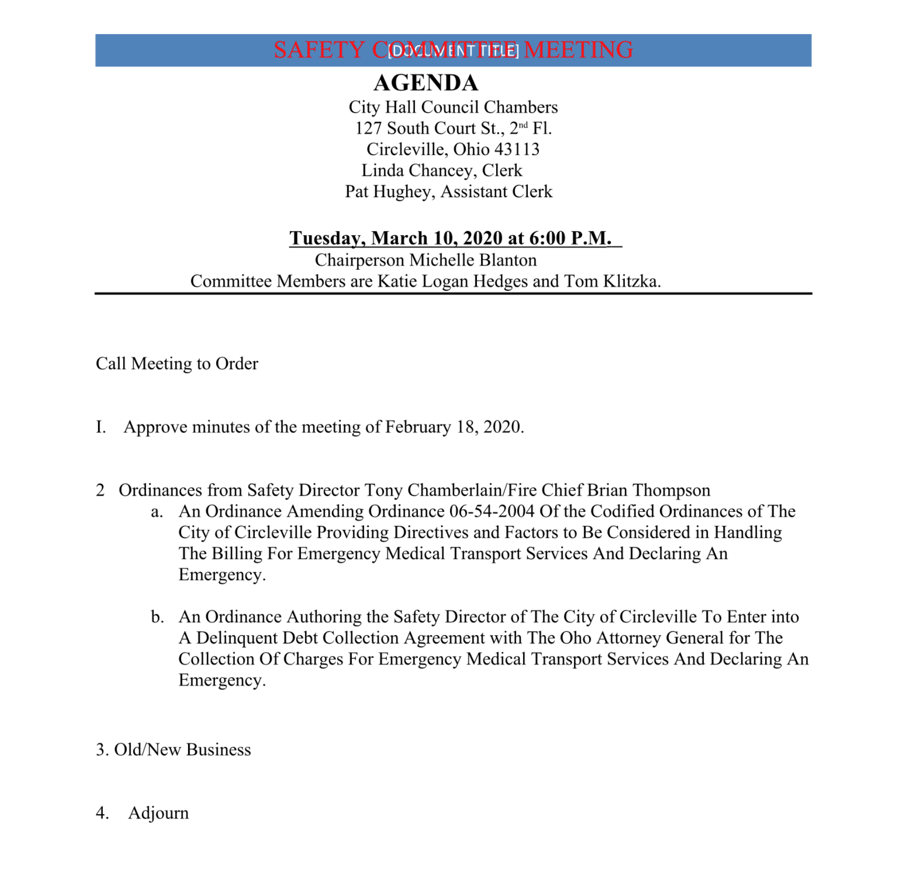 The Safety Committee will come to order at 6 pm, two ordinances from Safety Director and Fire Chief Brian Thompson will be heard. Then any new business.