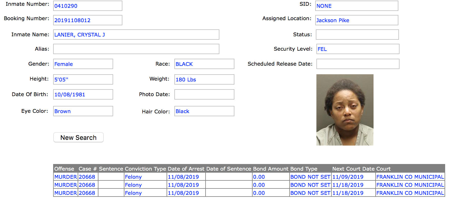 Today Franklin County Grand Jury has returned a three count indictment on Crystal J. Lanier, age 38, in connection to the November 7th, 2019 murder of her son’s father Thomas P. Battle, age 53, that occurred while their twelve year old son was in the apartment located in the 4400 block of Josephus Road in Whitehall. The counts in Lanier’s indictment include two counts of Murder and one count of Tampering With Evidence, with all three counts having Firearm Specifications.