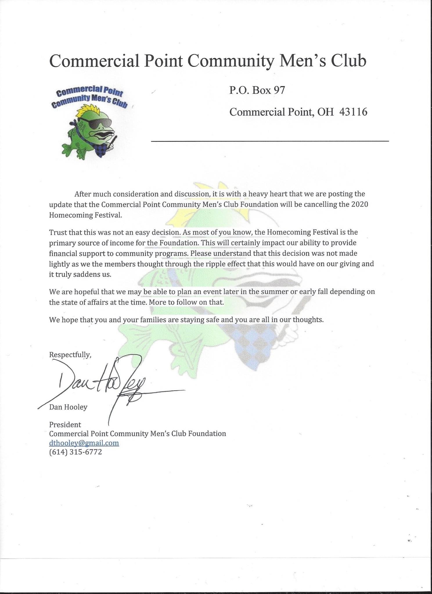 COMMERICAL POINT – Commerical Point Mens Club has decided to cancel the 2020 Homecoming festival after, “much consideration and discussion.”