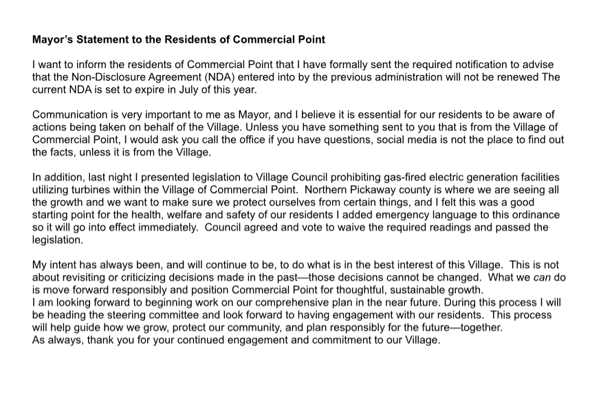 Commercial Point Mayor Moves to Ban Gas-Fired Turbine Power Plants and Stop NDA Agreements to Protect Residents