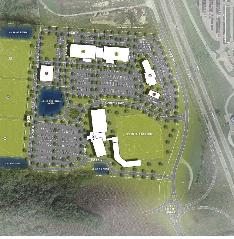 The plans that were released that March also showed a different conceptual layout, but plans and renderings since September of 2023 remain consistent with five buildings, three baseball diamonds, plus a proposed new Chillicothe Paints baseball stadium.