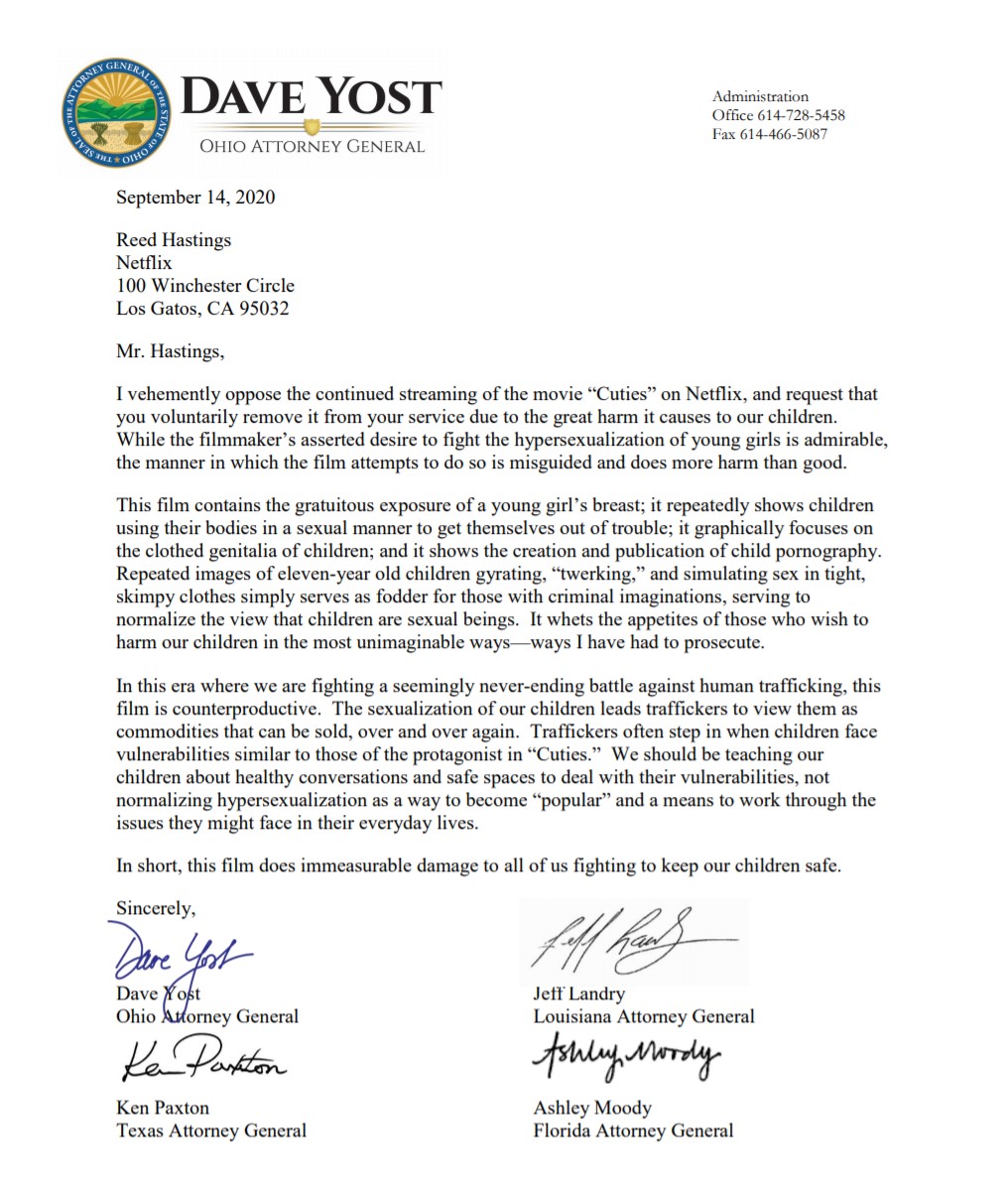 (COLUMBUS, Ohio) — Ohio Attorney General Dave Yost, Florida Attorney General Ashley Moody, Louisiana Attorney General Jeff Landry and Texas Attorney General Ken Paxton today requested that Netflix remove the film “Cuties.”