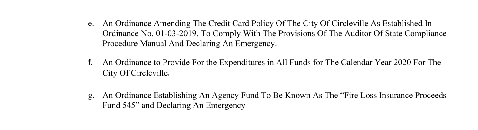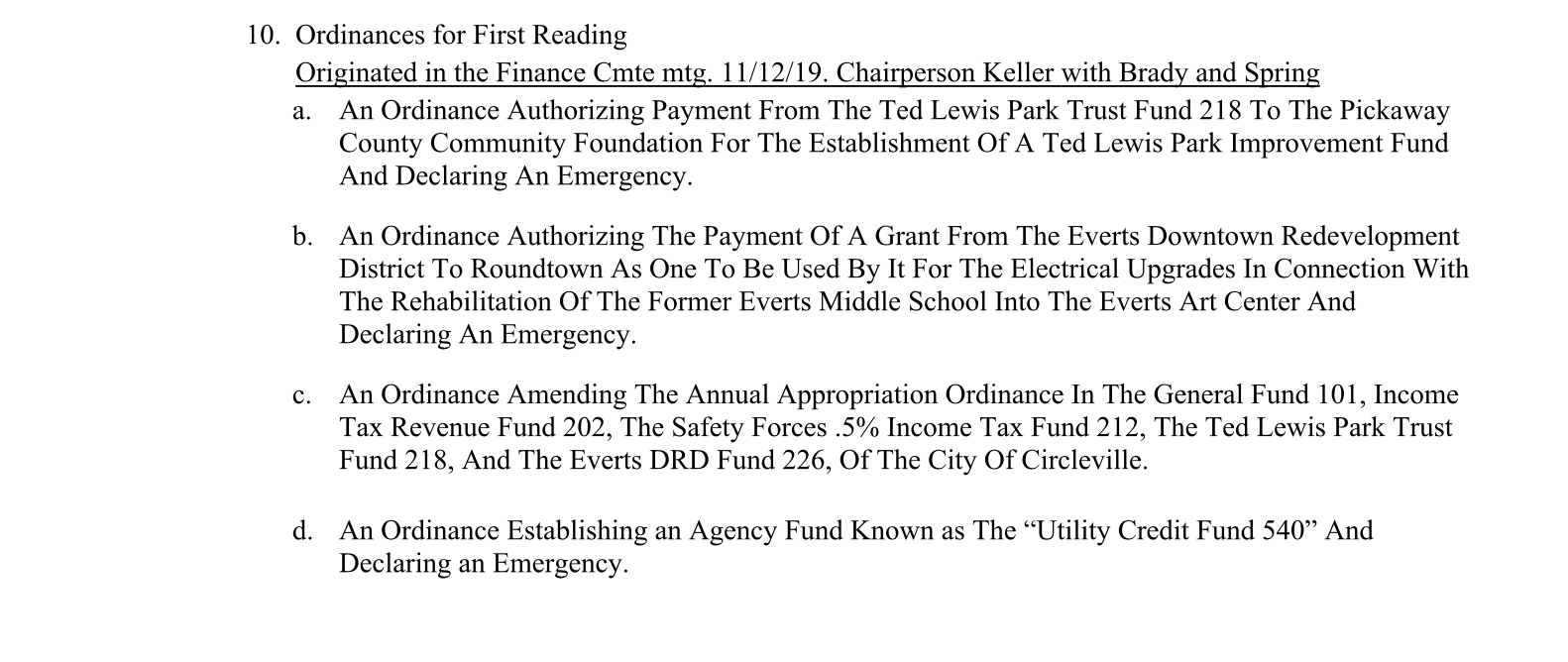 CIRCLEVILLE – Circleville Council meeting will come to order on November 19th at 7pm. Council will discuss old business first then hear from other council members and committee reports. City officials then will report, and then the floor will be open for anyone who wishes to address city council.