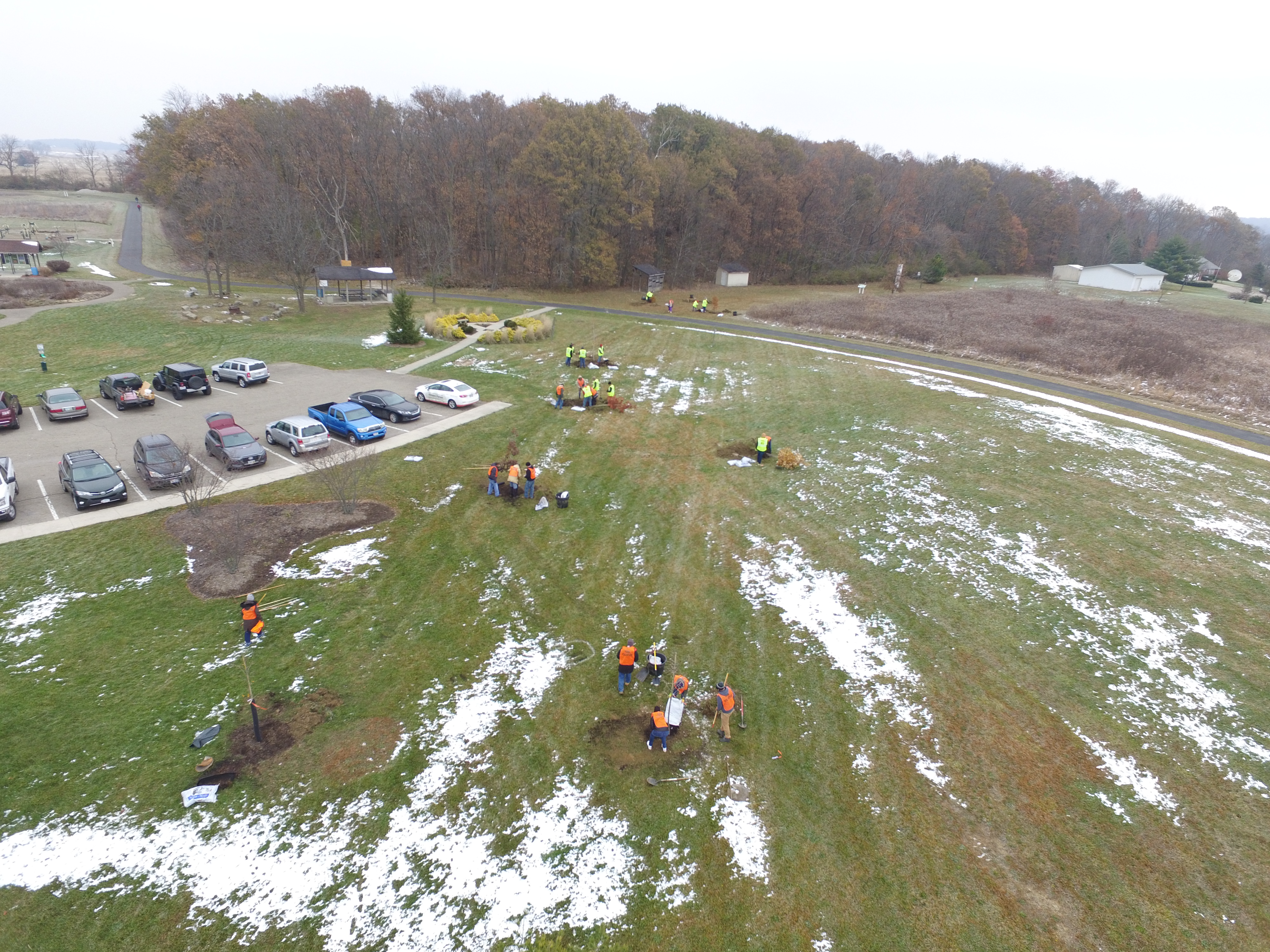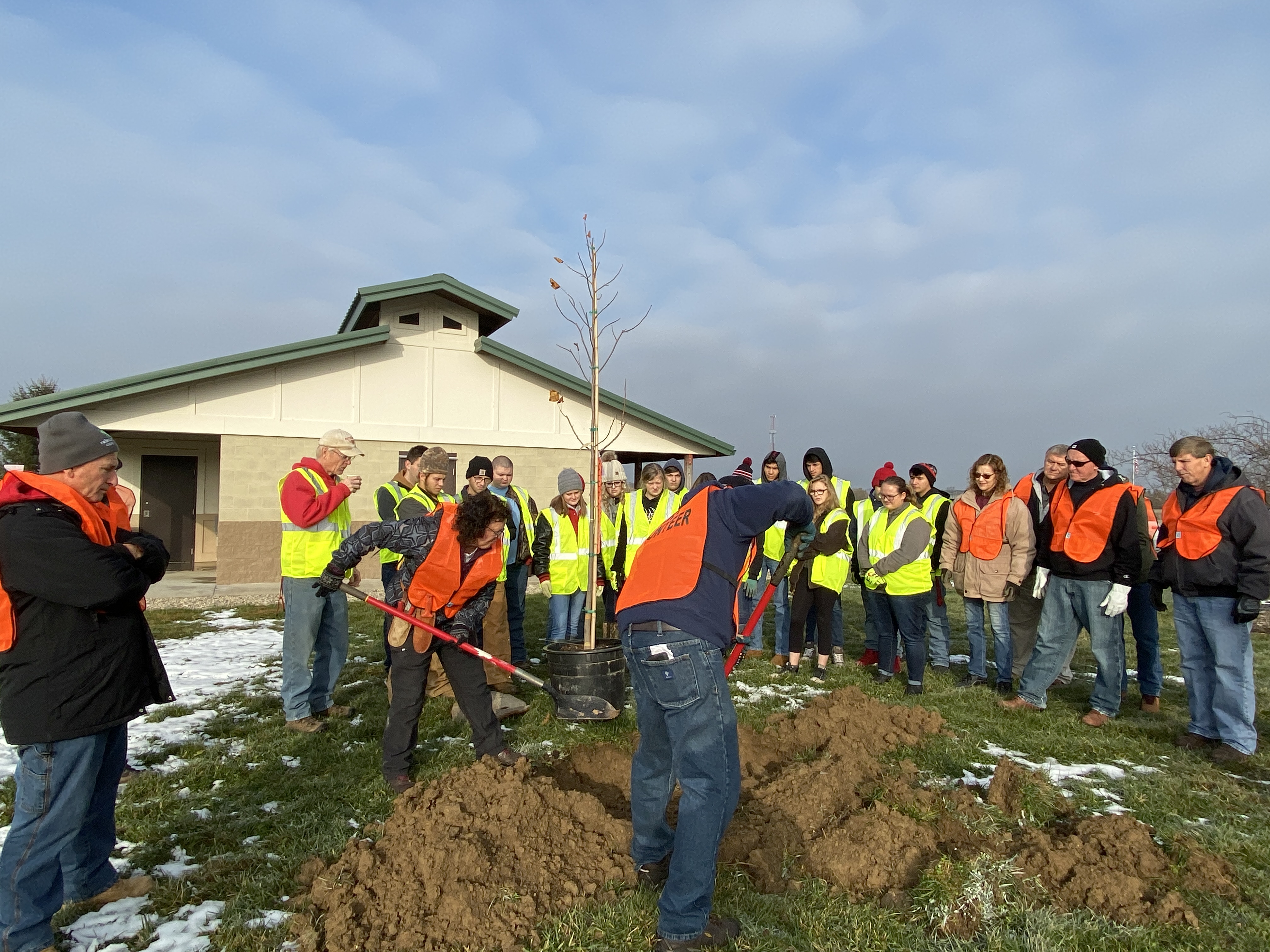 CIRCLEVILLE – It was a chilly day in Mary Virgina park at 9 am, on Friday November 15th, but over two dozen volunteers consisting of High School Seniors from Circleville High, Friends of Mary Virginia Park, Circleville City Service Department, County Park Board, Dupont and the Tree Commission, came out to the park to plant twenty six trees that were funded from a grant.