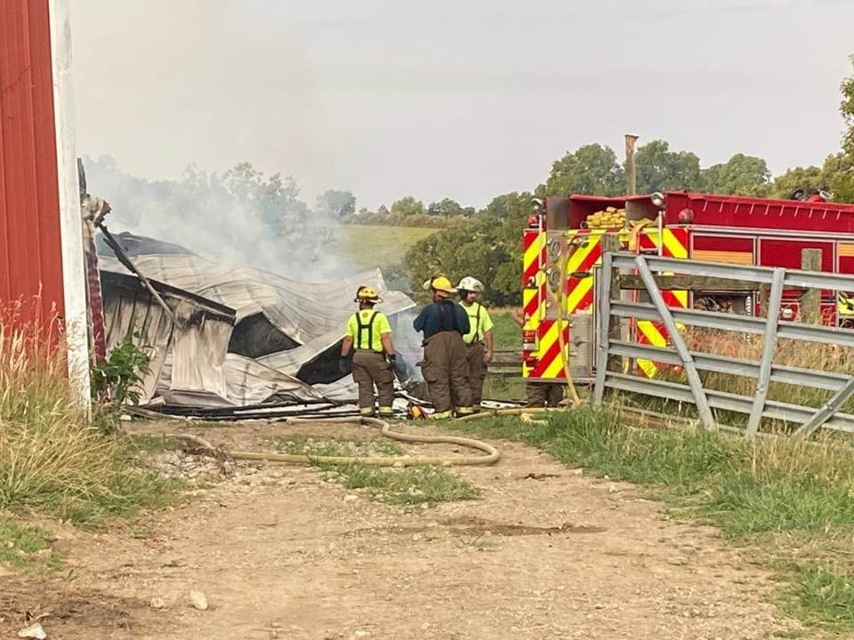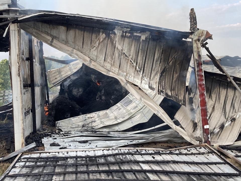 The fire took the hay barn completely, no animals were hurt in the fire, heavy equipment was brought in to break apart the hay rolls that were on fire.