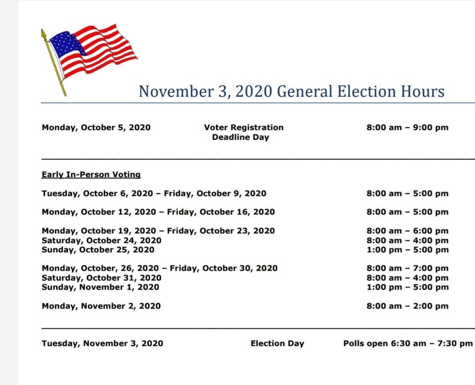 They will also have information on election day on Tuesday, November 3, 2020, Polls are open 6:30 am –7:30 pm that day also.