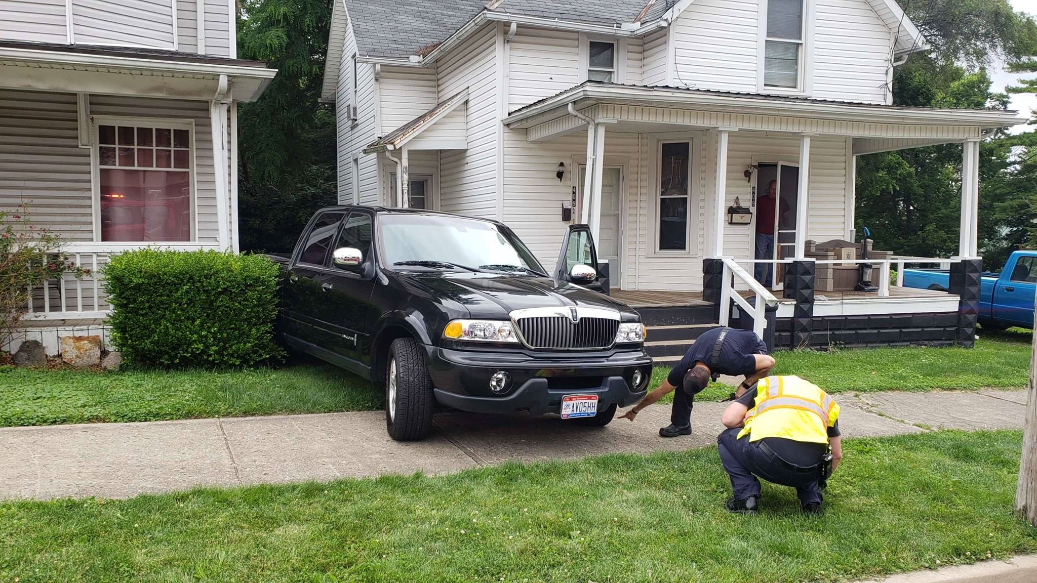 The vehicle continued down the incline, rolling backwards, north bound, on N. Court St. The driver of the vehicle was thrown to the roadway as the vehicle, quickly, spun around to final rest in the front yard(s) of 407/409 N. Court St. The front tires(s) of the vehicle ran over the driver causing serious injuries. The driver died at the scene.