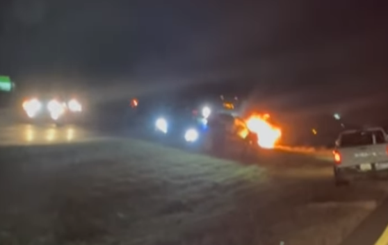 Emergency officials say the two occupants inside the burning vehicle were able to self-extricate before fire crews arrived on scene. Firefighters quickly extinguished the fire while law enforcement and emergency responders worked to secure the area and investigate the crash.