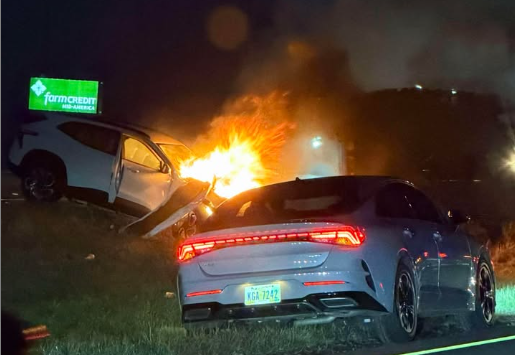 The crash occurred around 5:45 p.m. in the area of the Interstate Batteries facility in Pickaway County. According to early reports, two vehicles were involved, and one of them became fully engulfed in flames shortly after the collision.