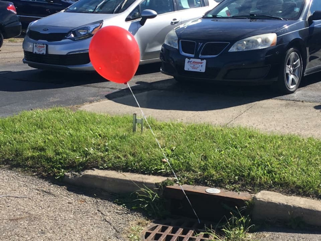 Tri-County Chrysler products is located at 1290 Hebron Rd just south of Newark. The ballons were placed in a way that represents a Steven King Movie called “IT.” Where a predatory shapeshifter called Pennywise lives in the sewer and takes the form of a wisecracking clown, with balloons. “We all float down here!”