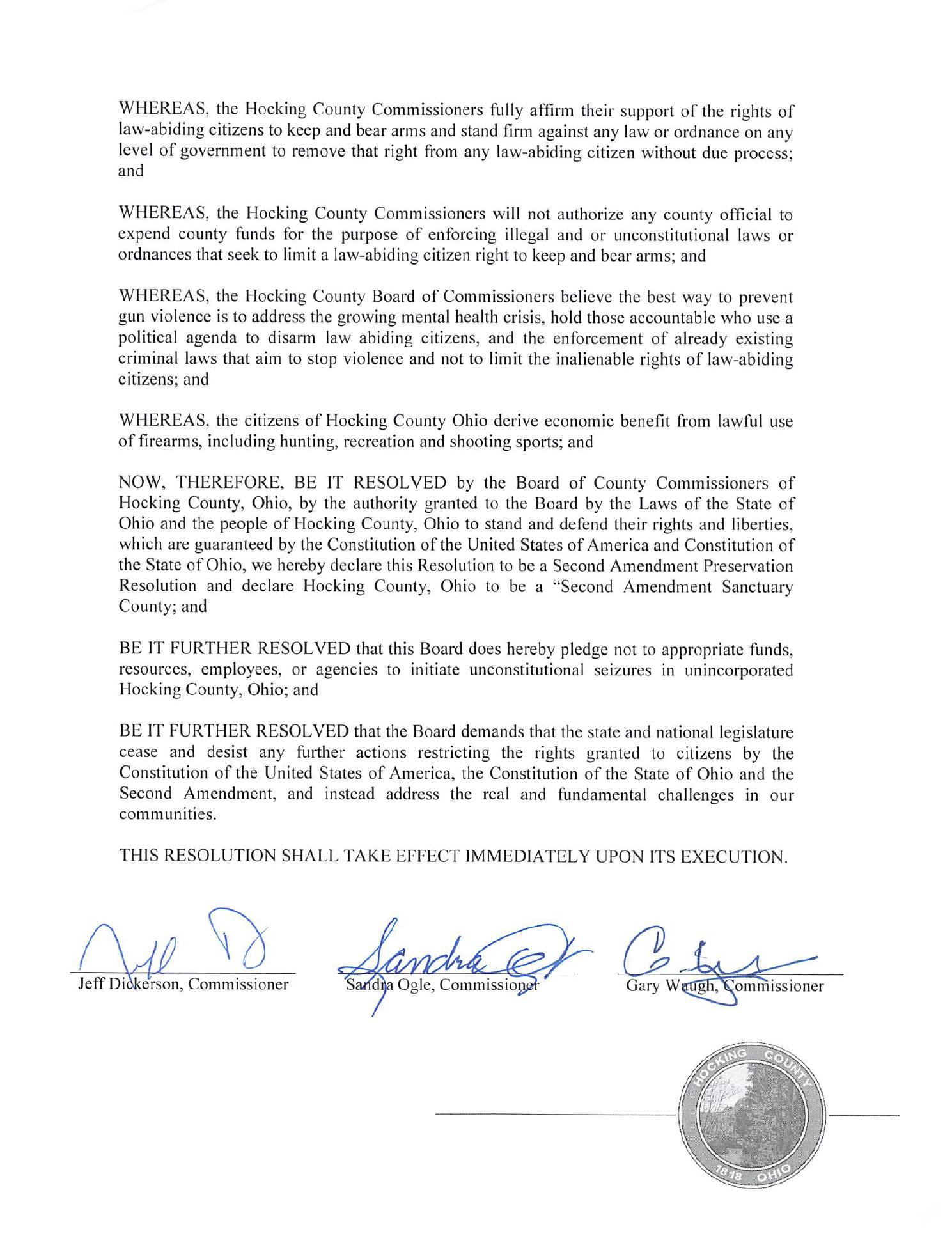 HOCKING – Hocking County Board of Commissioners pass resolution declaring county a gun sanctuary County. This Totals Ohio Counties to eleven with recent adoption by Pike here: http://www.sciotopost.com/pike-county-becomes-2a-sanctuary-county/