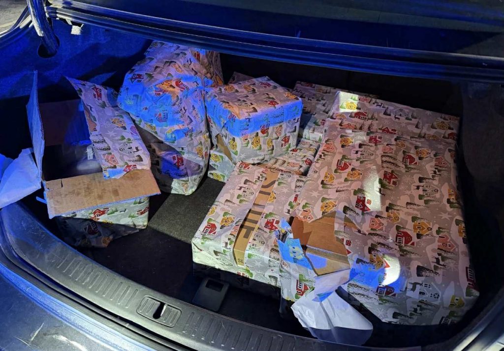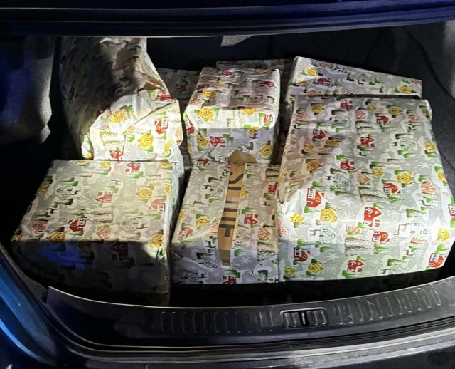 Investigators said Talamantes arrived at the location in a vehicle and attempted to walk away from officers but was detained. A police K9 conducted an exterior sniff of the vehicle and alerted to the presence of narcotics. A subsequent search of the trunk uncovered multiple boxes wrapped in Christmas paper.
