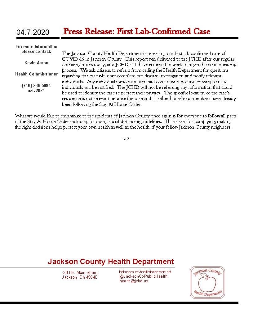 Jackson – Jackson County Health Department is reporting it’s first lab confirmed COVID-19 case.