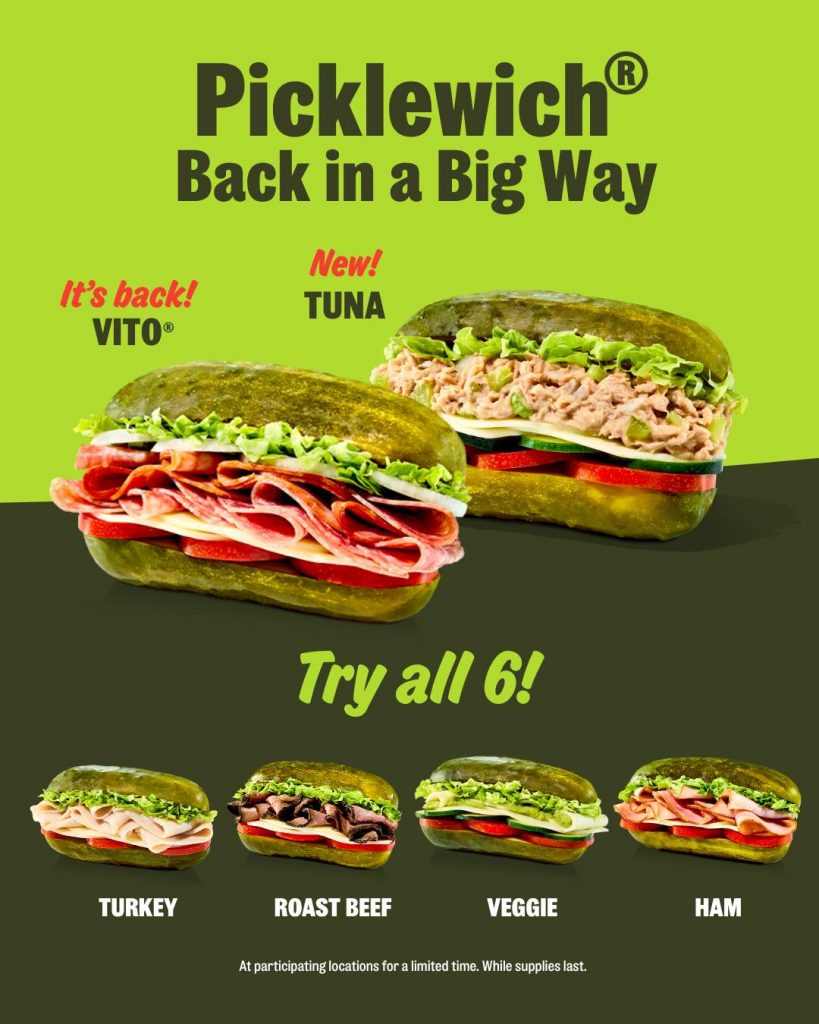 Starting October 27, the Picklewich returns to participating Jimmy John’s locations nationwide in six varieties: Vito®, Turkey, Ham, Roast Beef, Tuna, and Veggie. Each features Jimmy John’s signature fresh ingredients wrapped between two massive pickle halves.