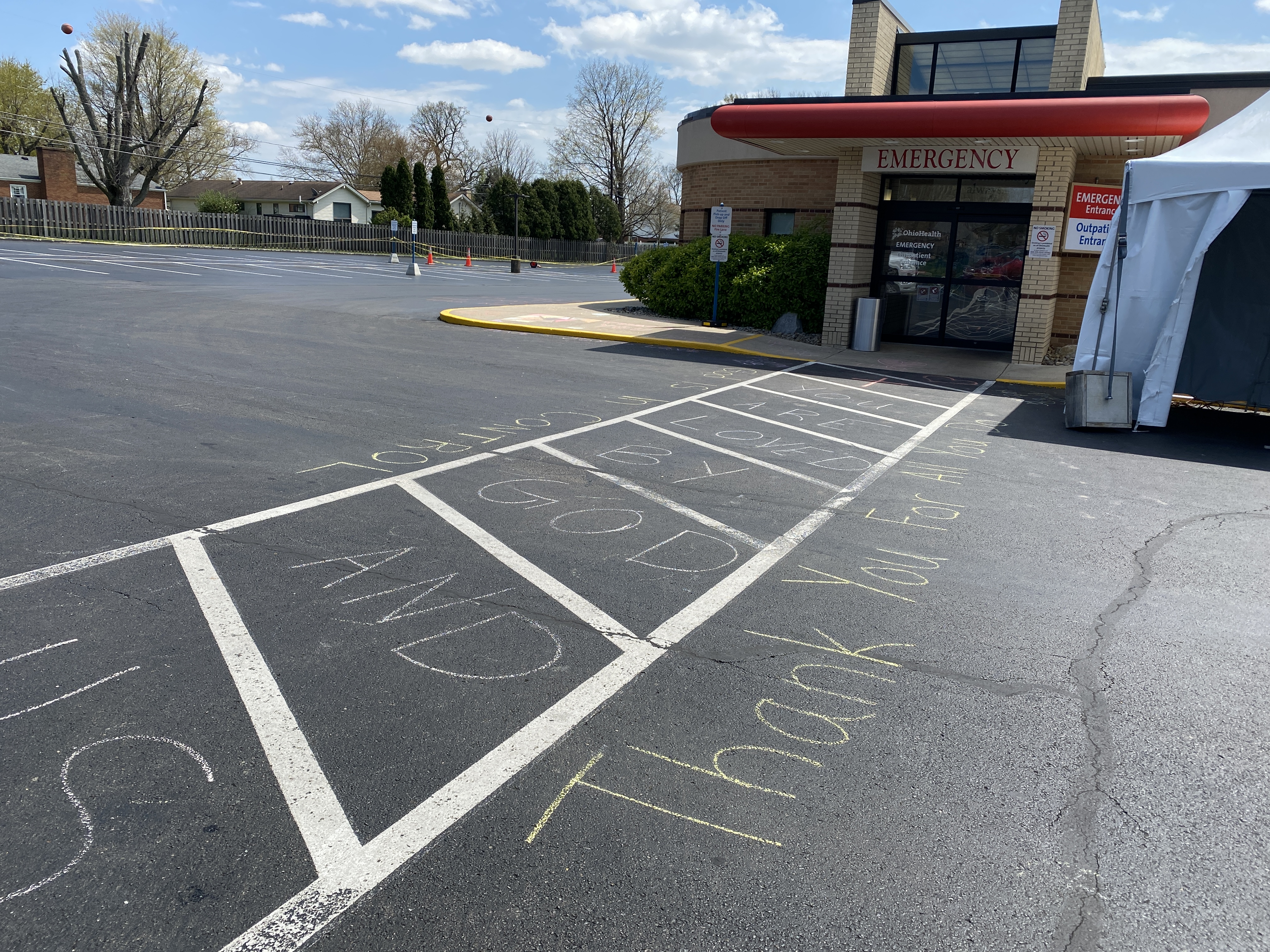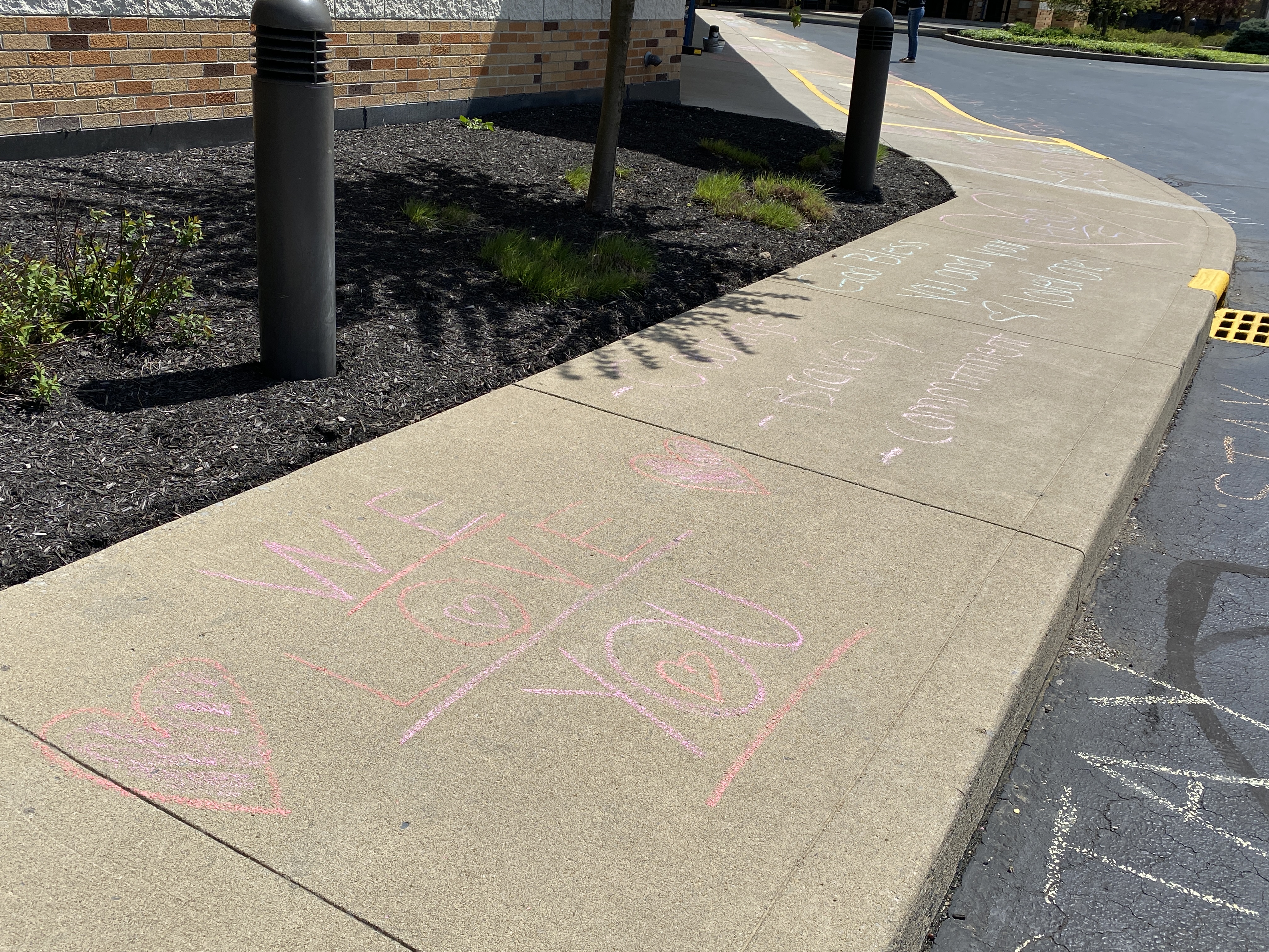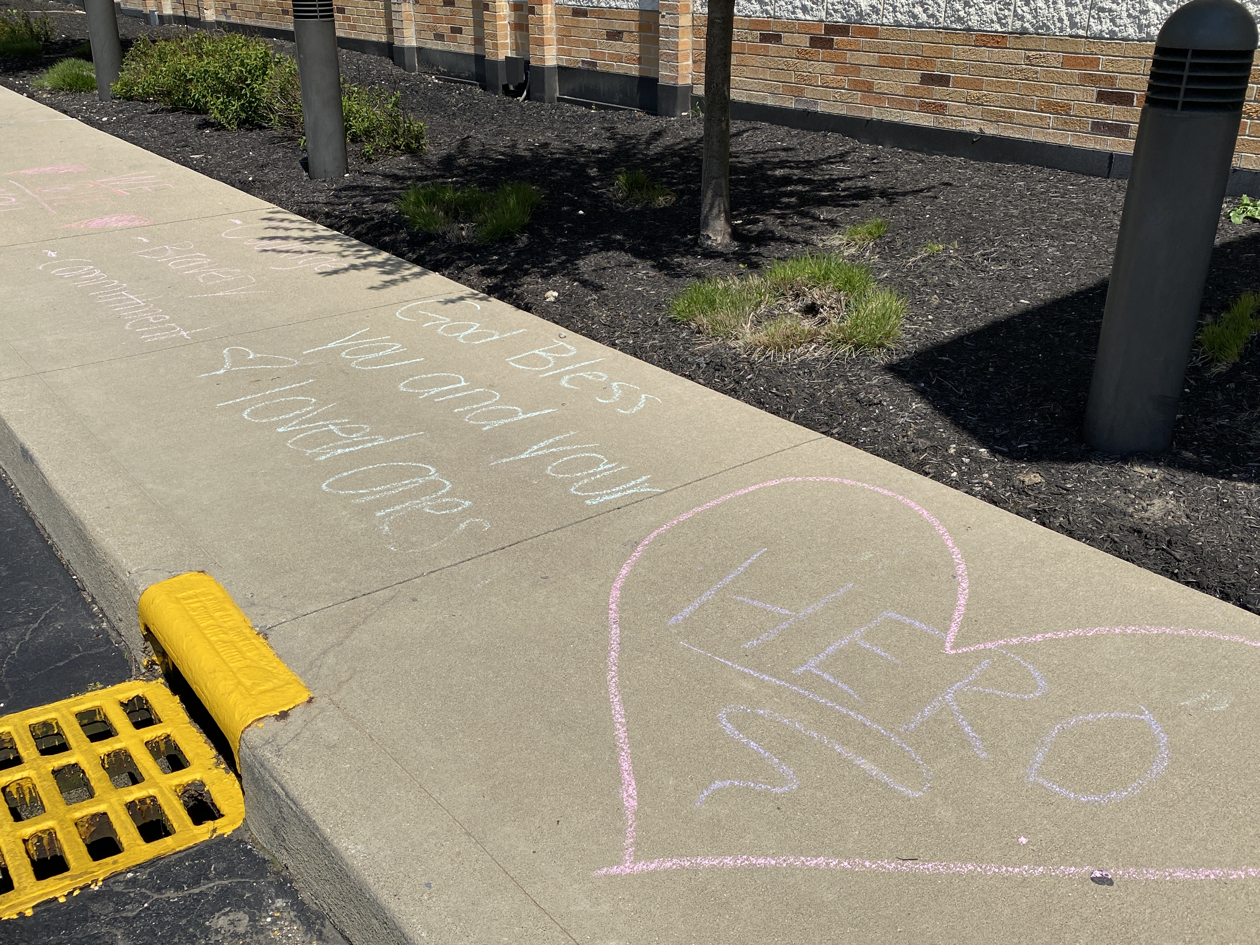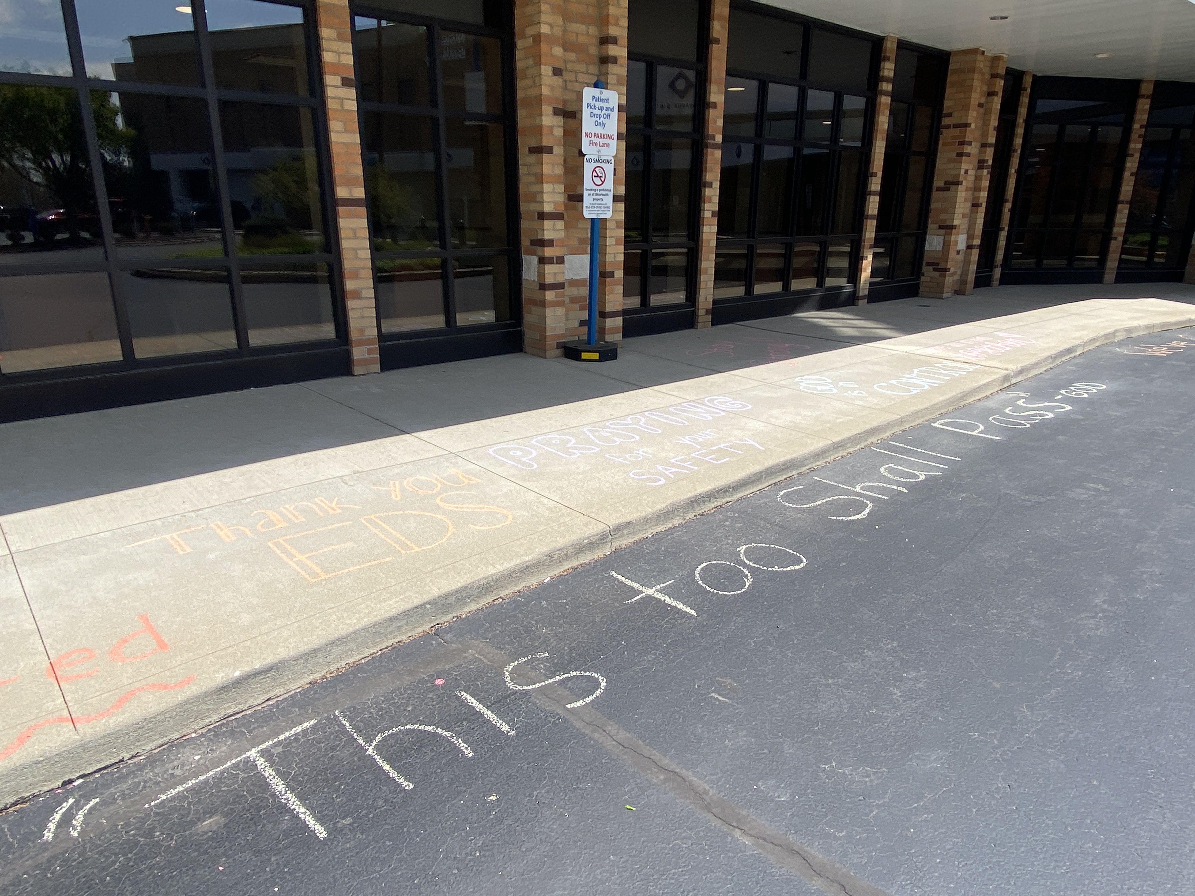 Words written in chalk in the sidewalks going into the front doors and emergency doors say, “HOPE, Thank You, We’ve got this Circleville, we are all in this together, God is in control, This too shall pass, Thank you EDS, Praying for your Safety, and Thank you for caring for our community.”