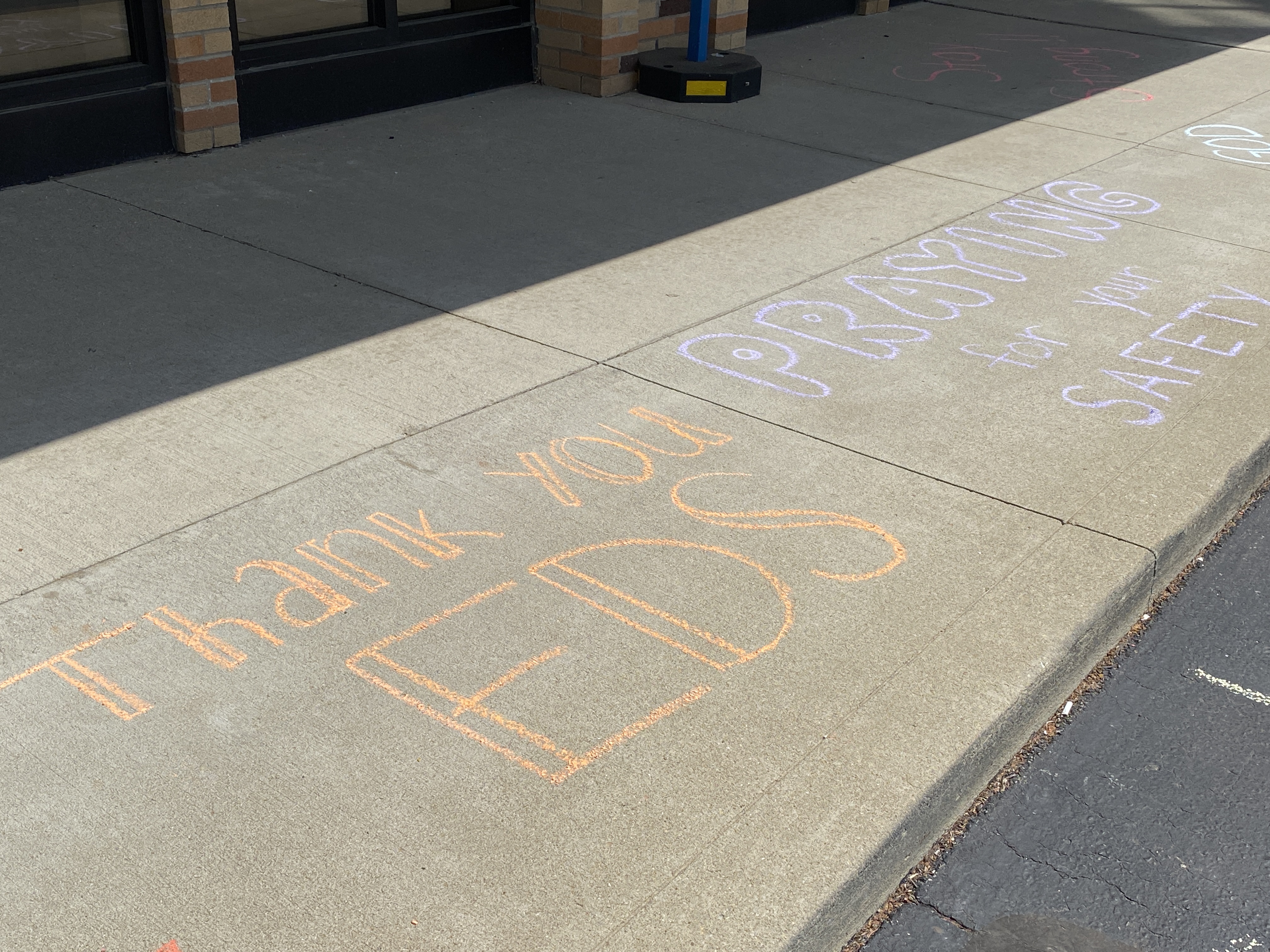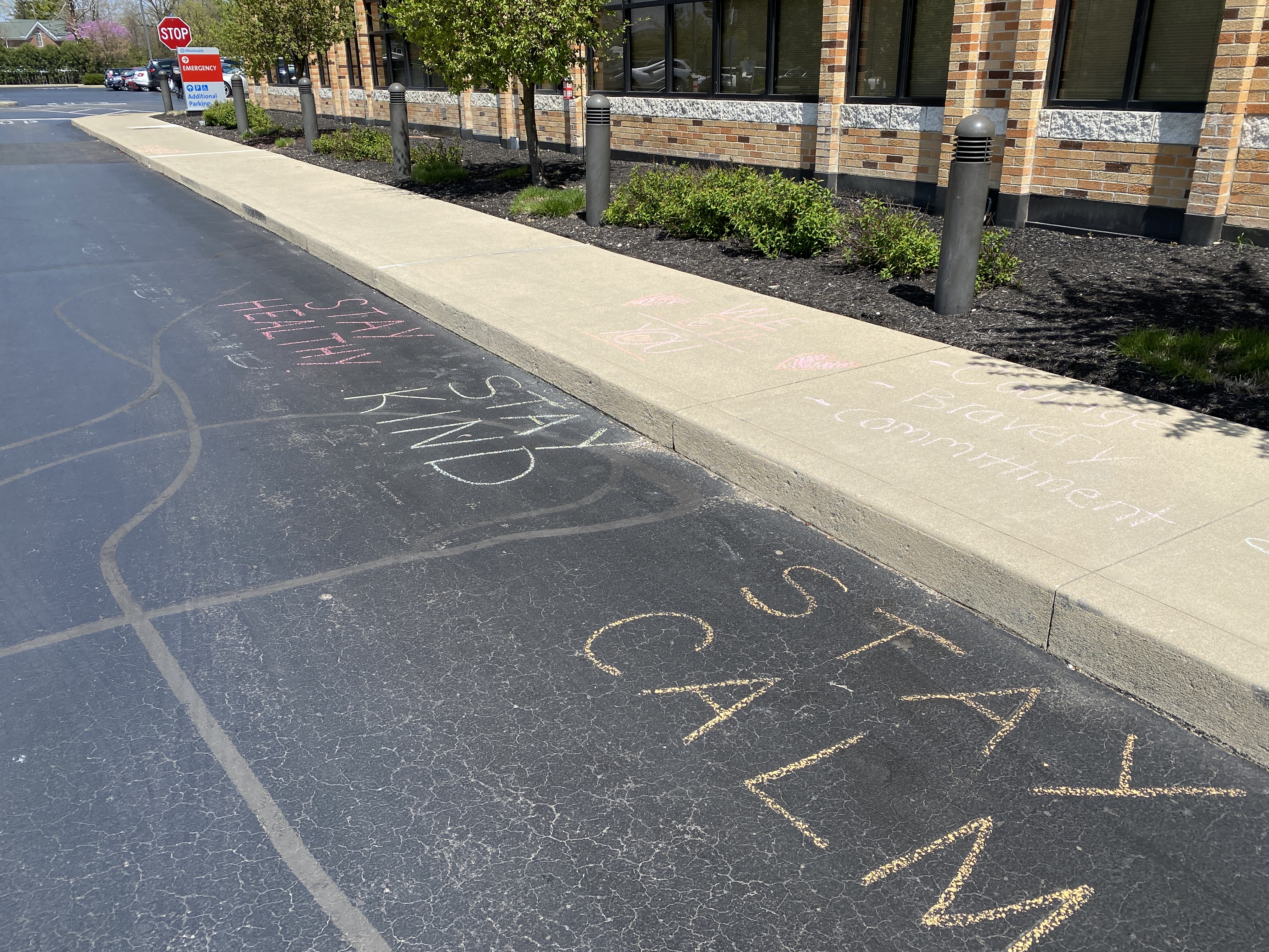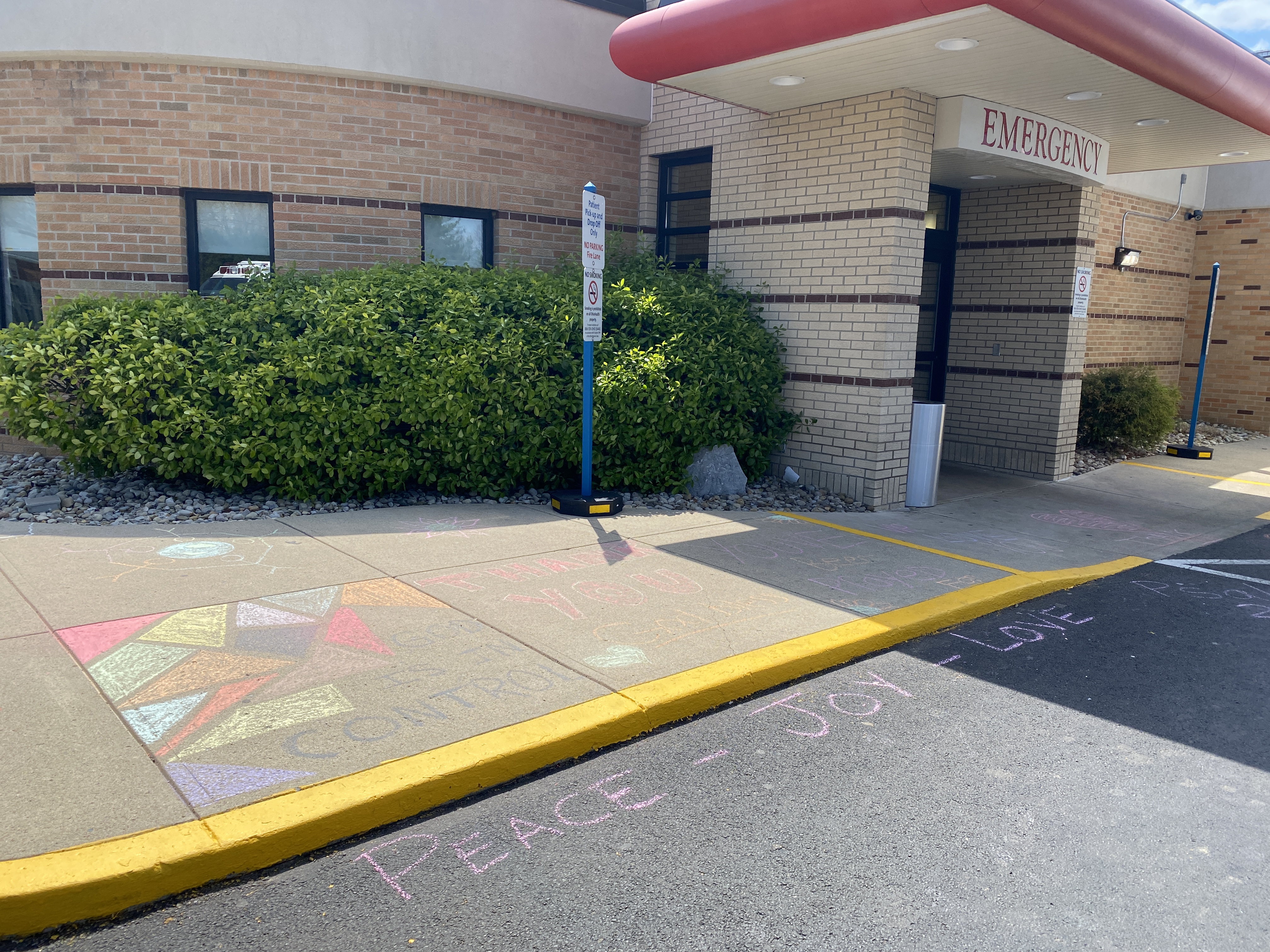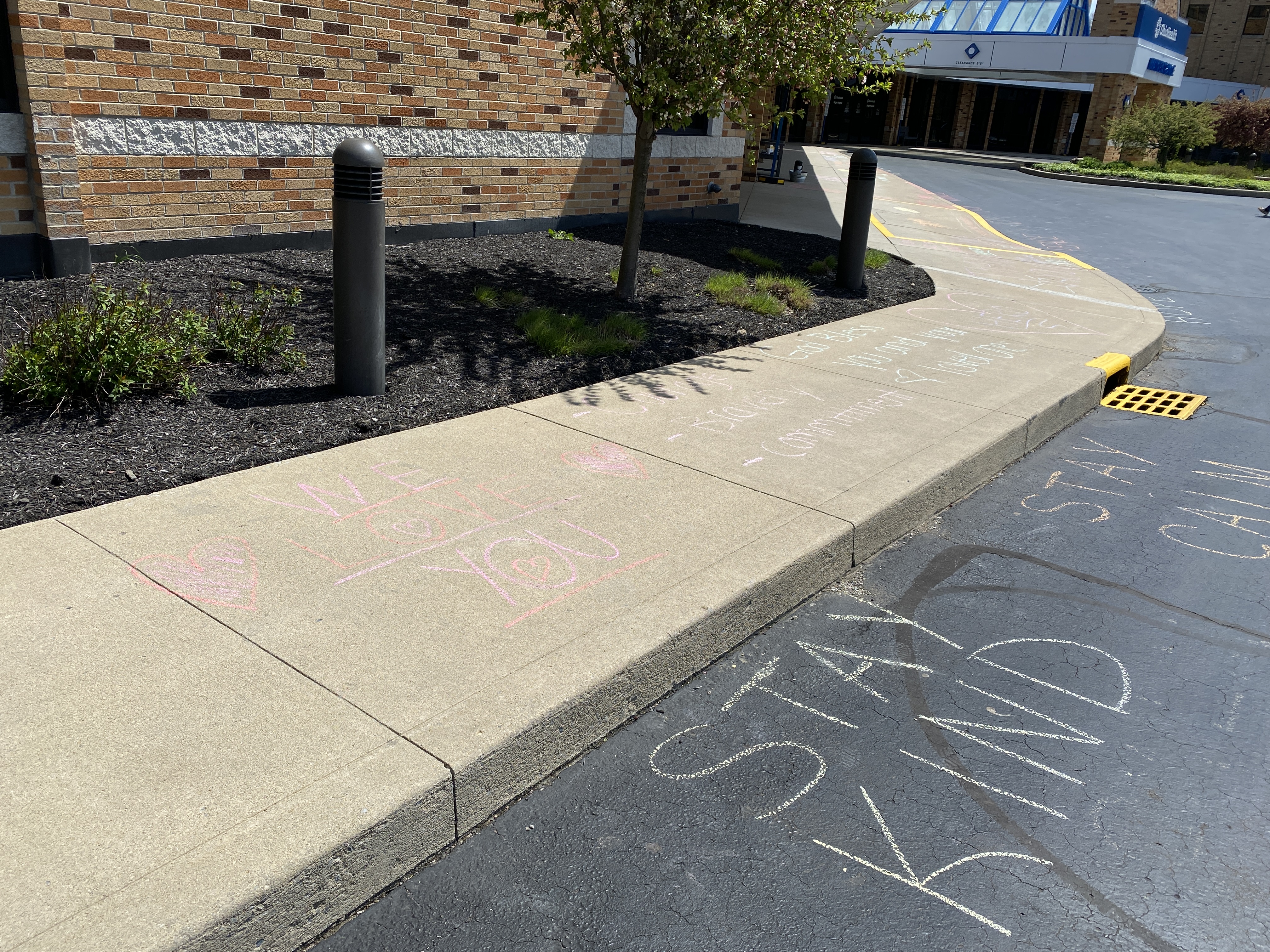 Words written in chalk in the sidewalks going into the front doors and emergency doors say, “HOPE, Thank You, We’ve got this Circleville, we are all in this together, God is in control, This too shall pass, Thank you EDS, Praying for your Safety, and Thank you for caring for our community.”