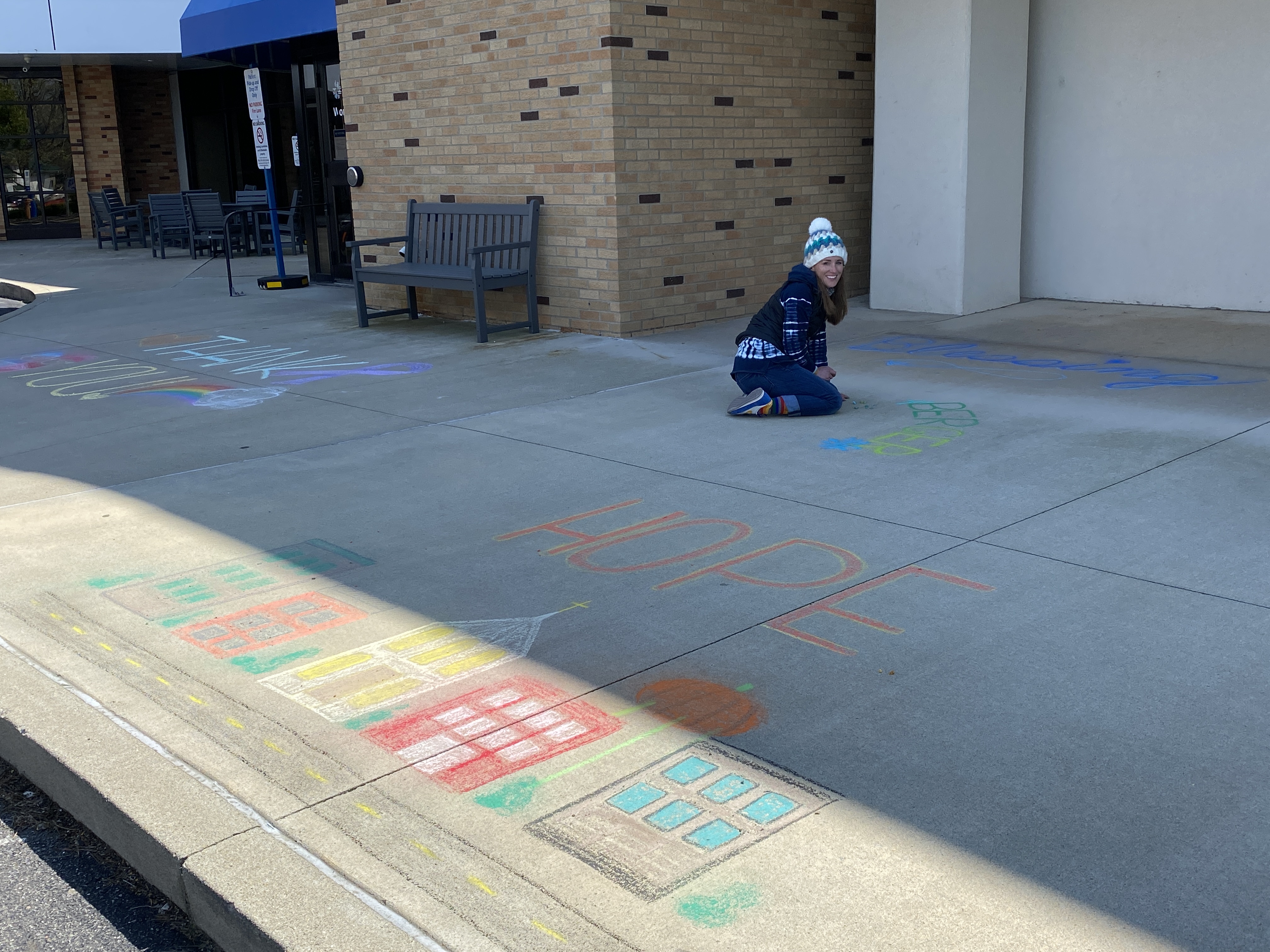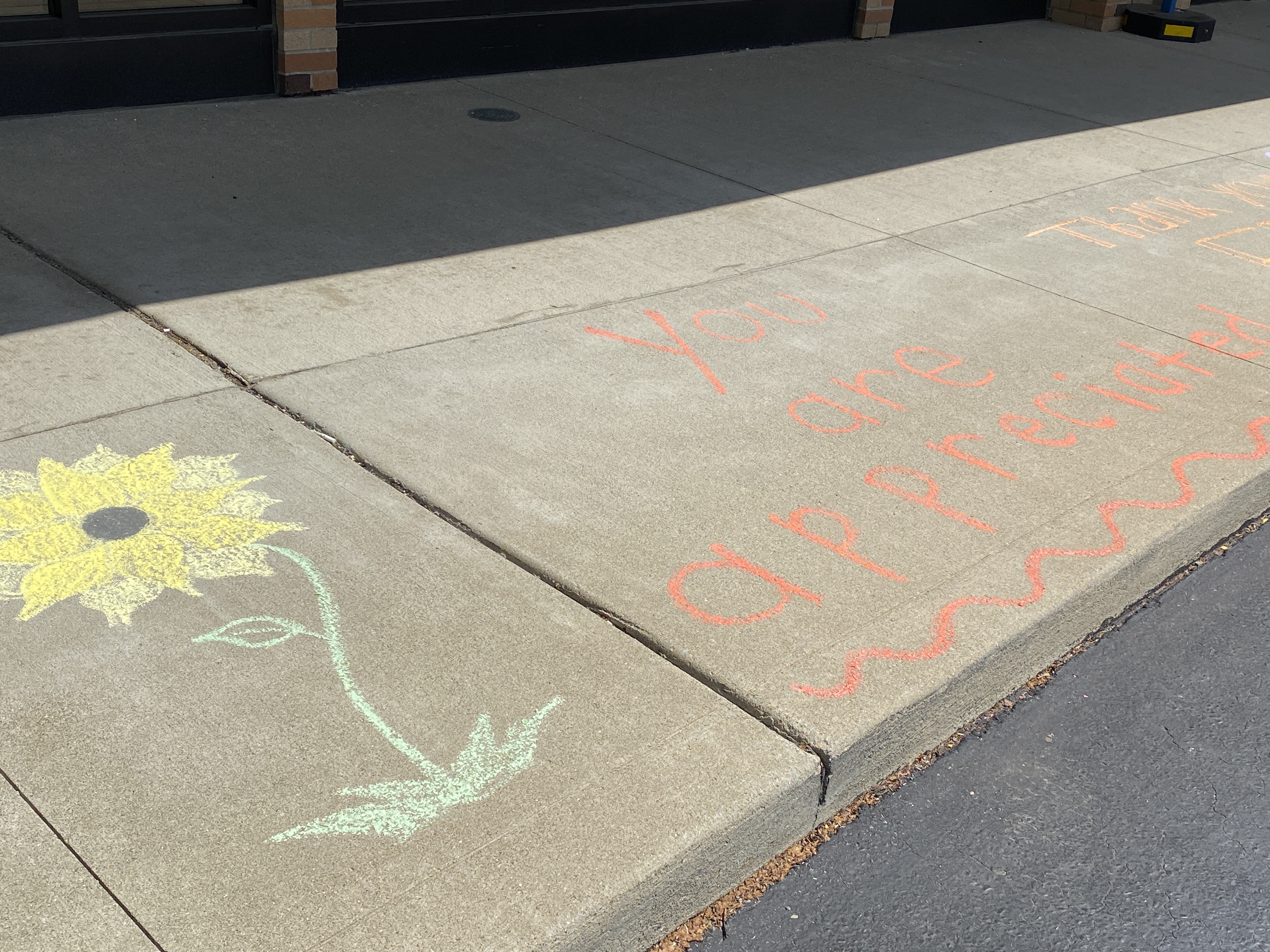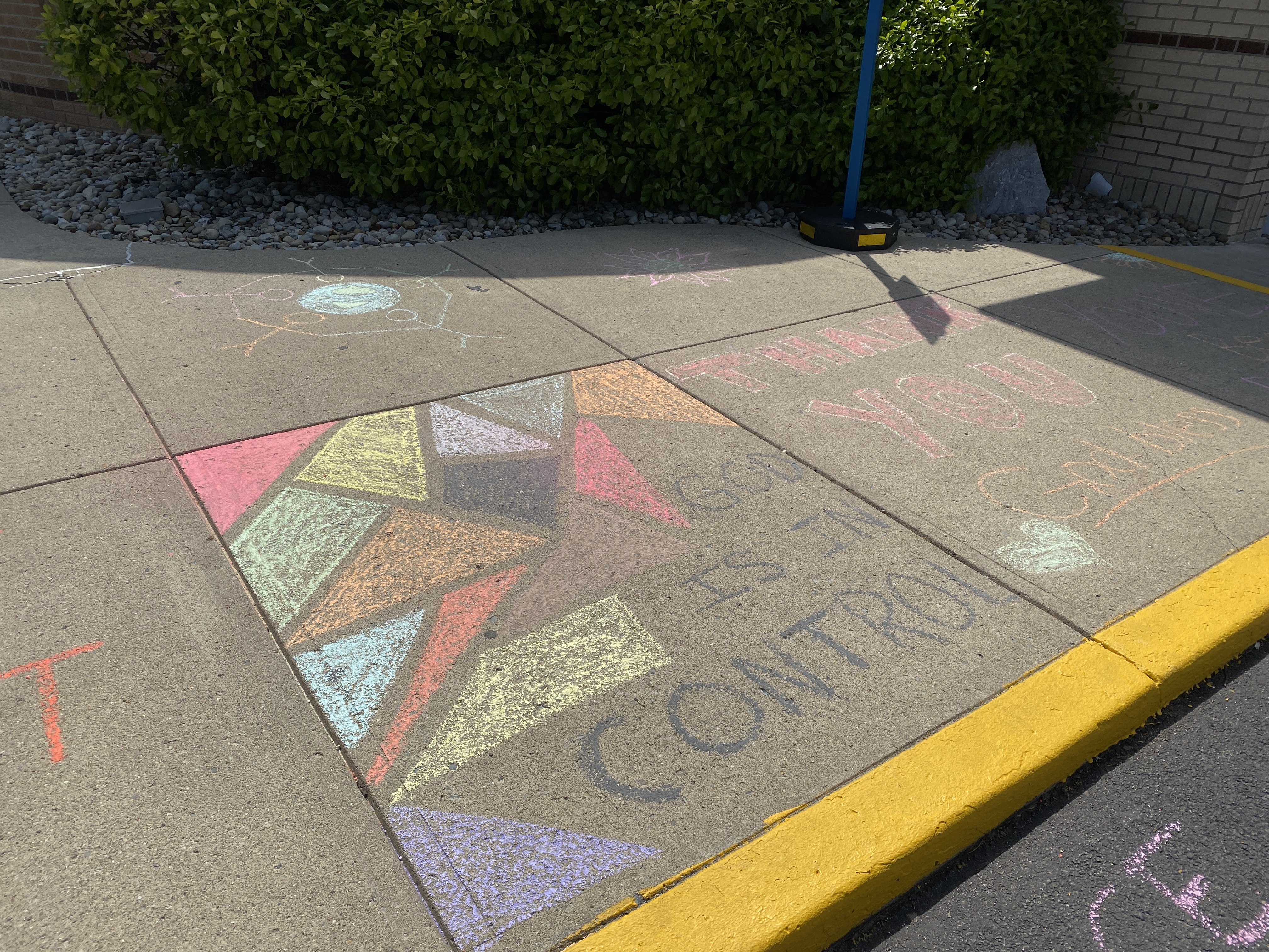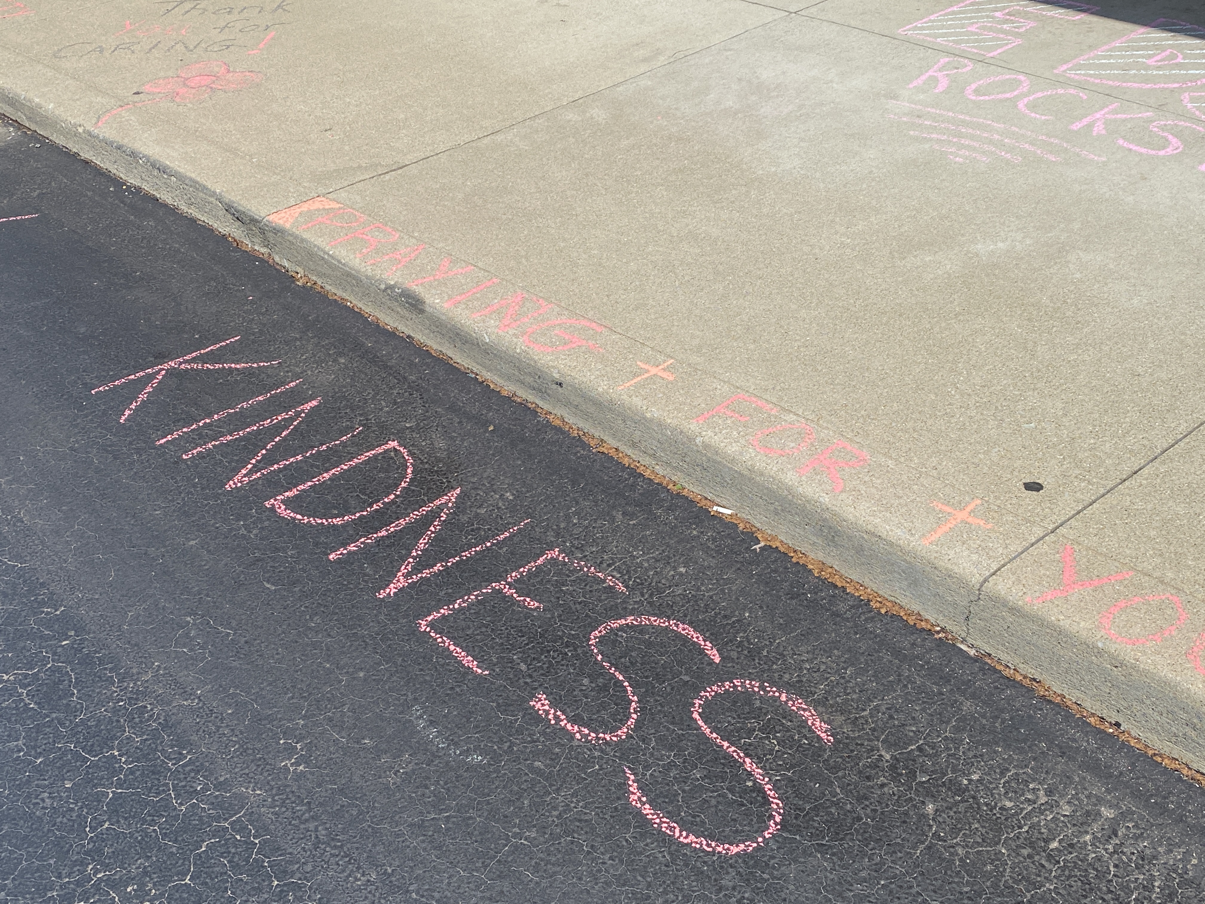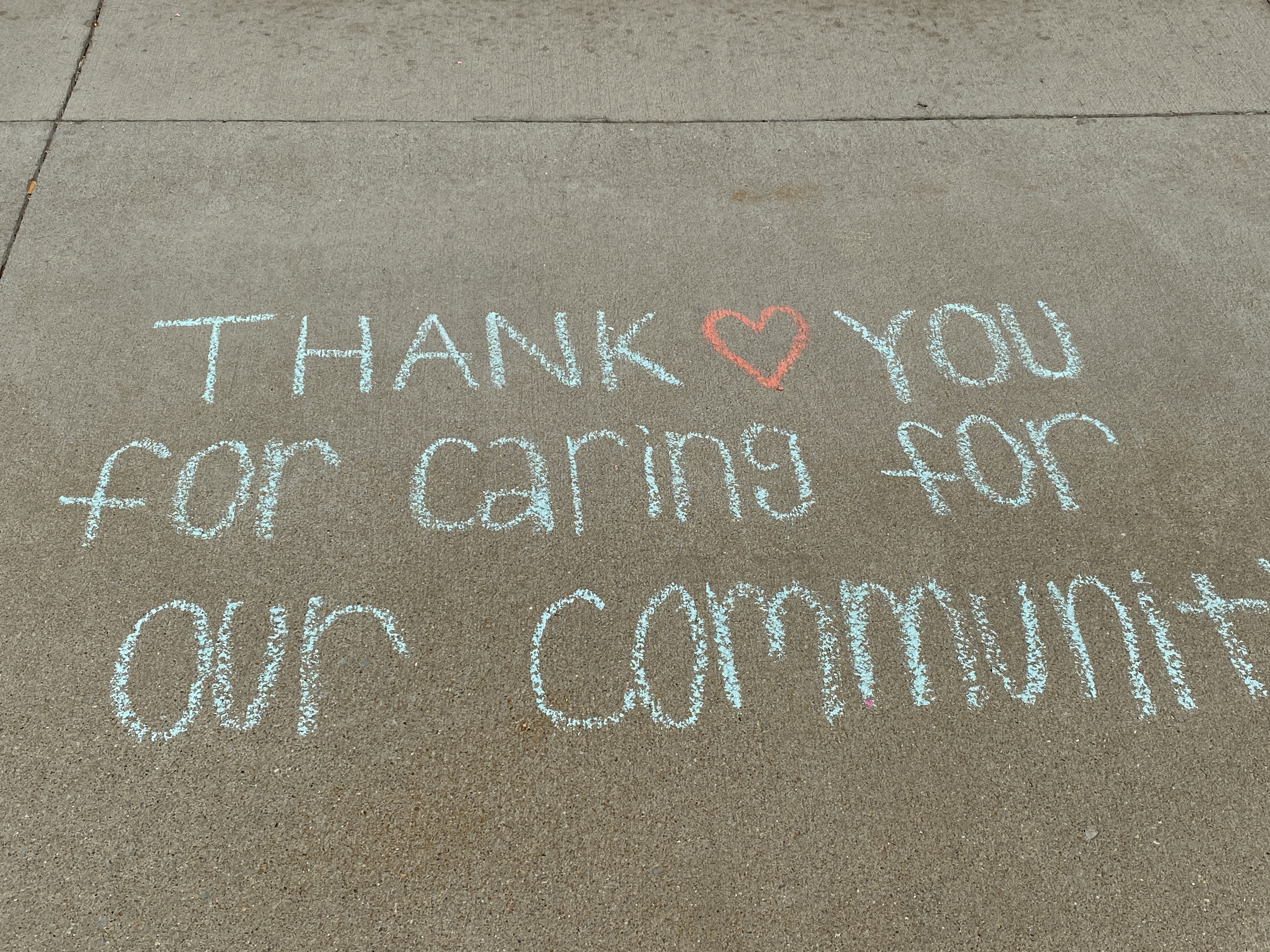 Words written in chalk in the sidewalks going into the front doors and emergency doors say, “HOPE, Thank You, We’ve got this Circleville, we are all in this together, God is in control, This too shall pass, Thank you EDS, Praying for your Safety, and Thank you for caring for our community.”