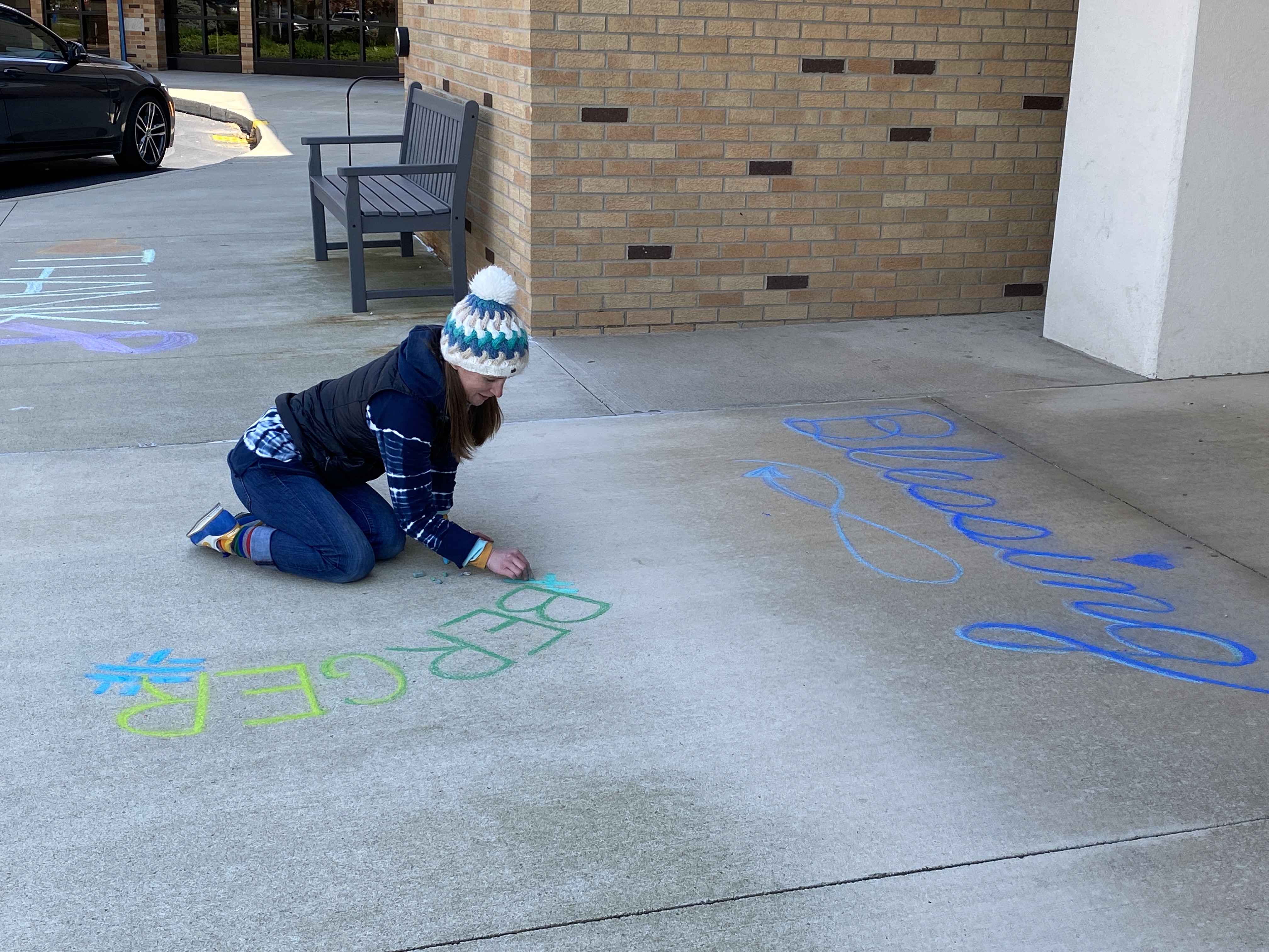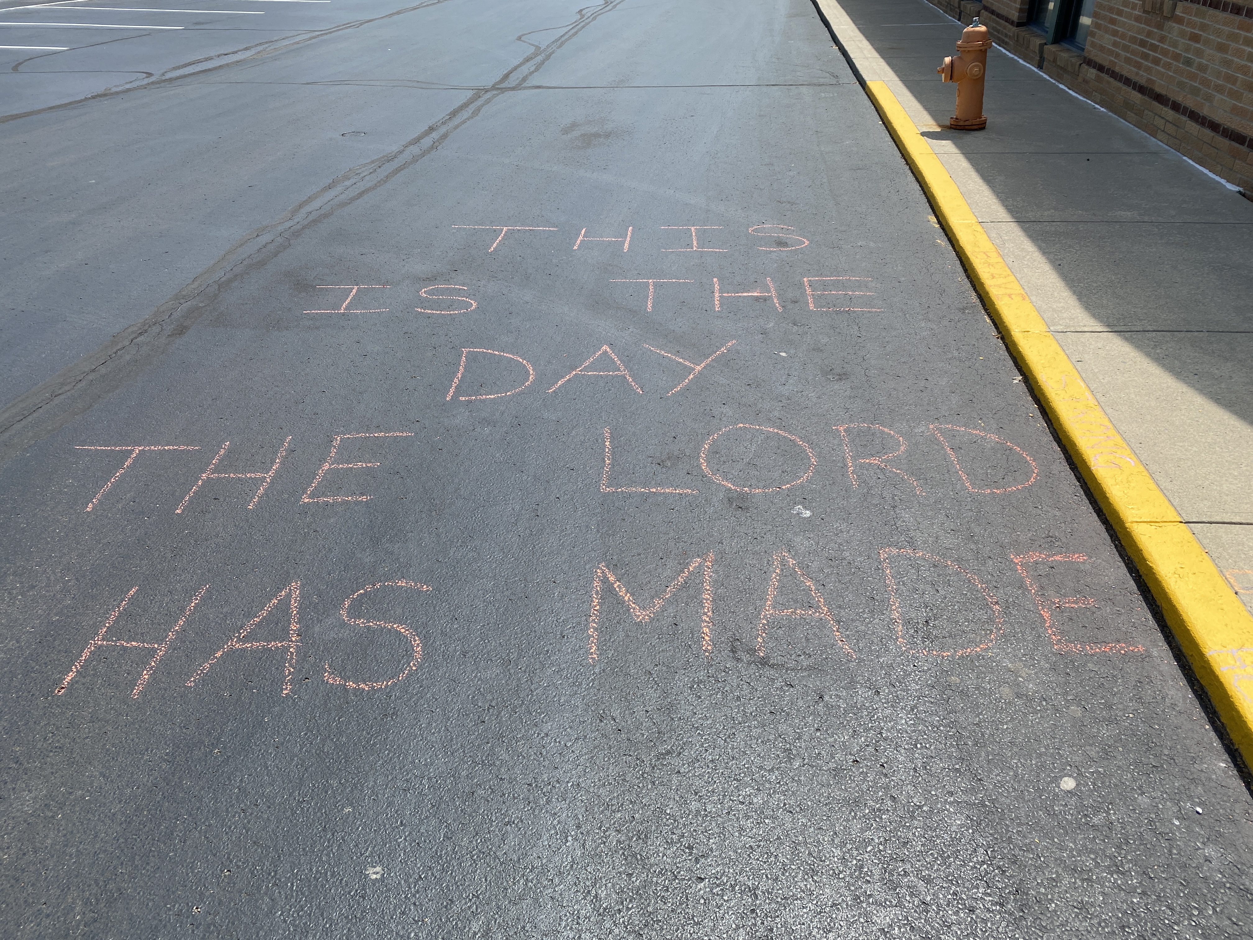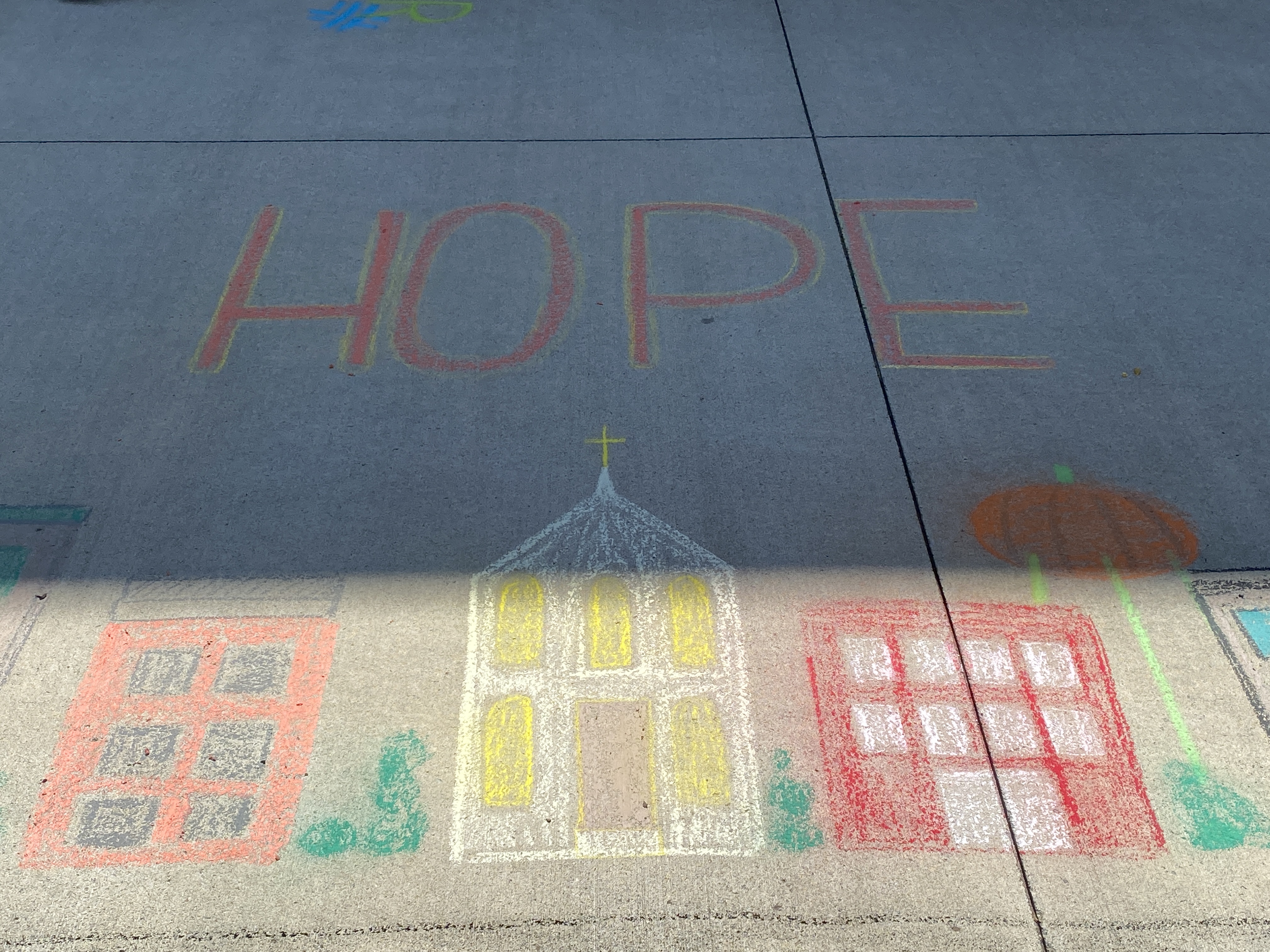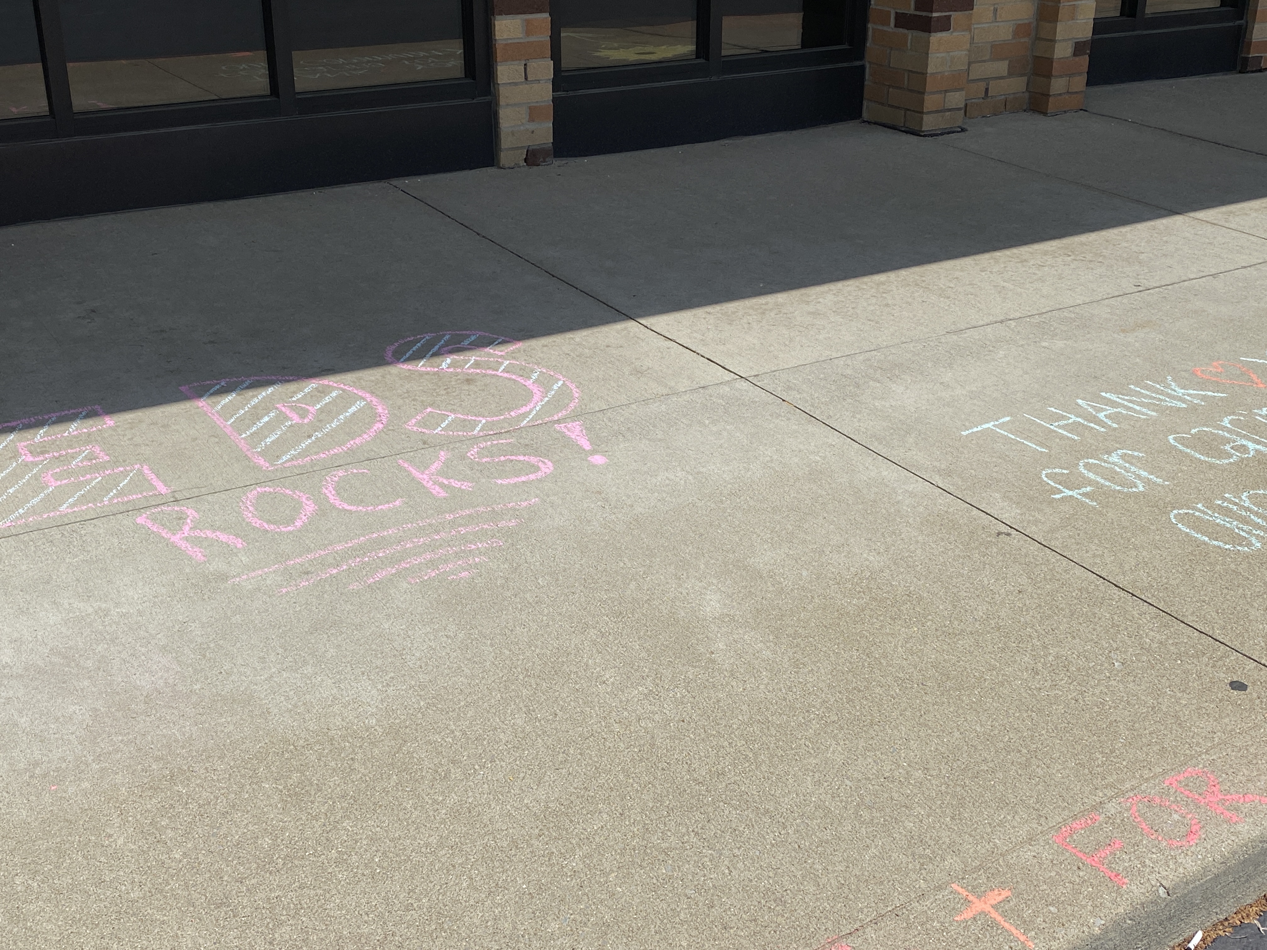 Words written in chalk in the sidewalks going into the front doors and emergency doors say, “HOPE, Thank You, We’ve got this Circleville, we are all in this together, God is in control, This too shall pass, Thank you EDS, Praying for your Safety, and Thank you for caring for our community.”