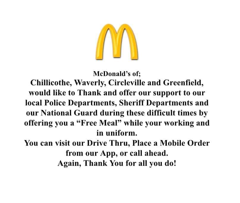 Chillicothe, Waverly, Circleville and Greenfield are all, “offering them a free meal to offer thanks and support to our local law enforcement during these difficult times.”