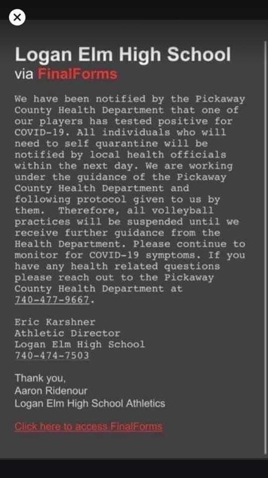 According to the report one person has been identified so far, and is self quarantined. All students that need to self-quarantined will be noticed. Until further notice all Volleyball practices will be suspended until Logan Elm receive further guidelines.